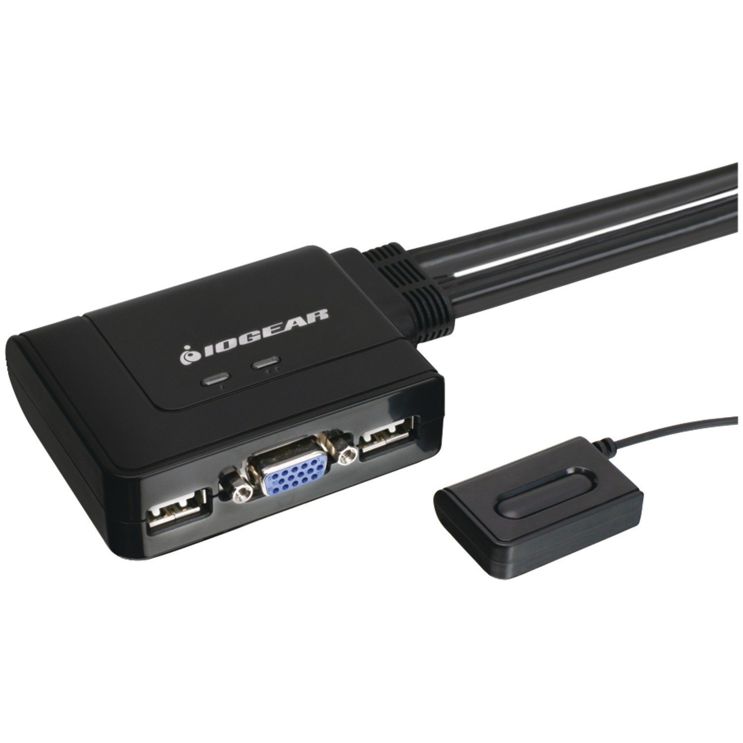 IOGear GCS22U 2-Port USB KVM Switch, 2-Port USB Cable KVM allows users to share a VGA monitor, a USB mouse, and a USB keyboard between two computers. Users can switch between computers using a manual switch located on a wired remote controller that can be placed on your desk for ease of reach. It offers an out-of-box solution with no additional cables needed. It supports multiple operating systems including Windows, Sun, and Mac. It is entirely plug-n-play and requires no software to run. It is also powered through the USB bus and thus does not require a power supply to run. It is the ideal KVM for those who want a competitively priced, entry level KVM that will allow them to multitask with two computers at their disposal.