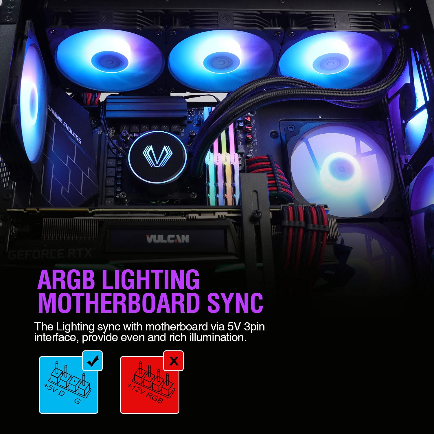 • Addressable RGB Fans & Pump: The Addressabe RGB lighting on the fans and pump can sync with motherboard via 5V 3pin interface, provide even and rich illumination.