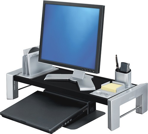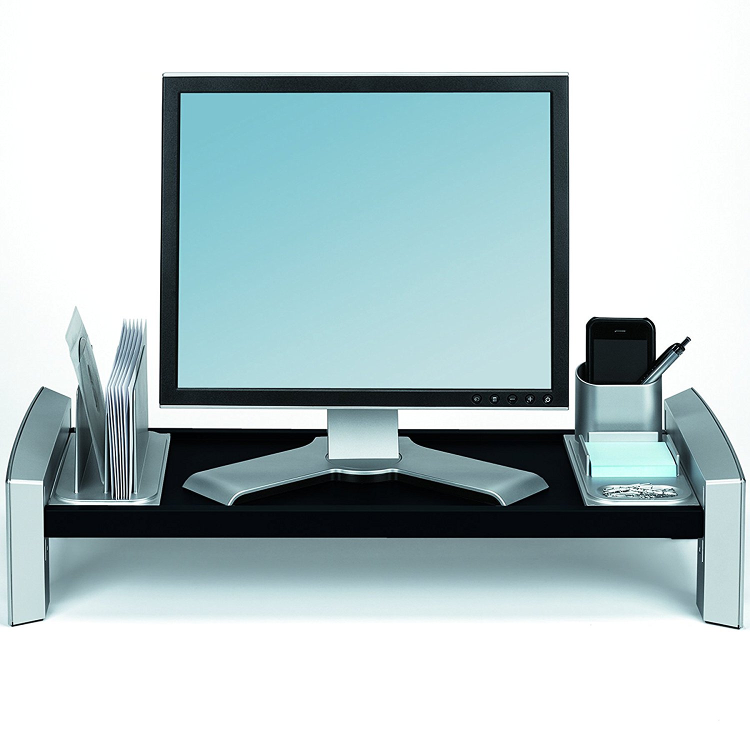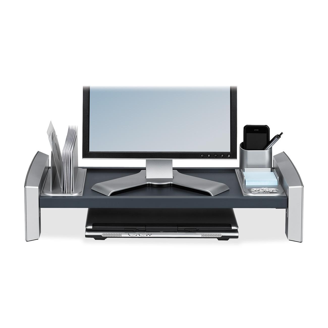 Flat panel workstation adjusts in height from 2-1/2" to 4-1/2". Slick Slide mat stows your laptop and/or docking station neatly under the top shelf. Customize the top shelf with a mini sorter and accessory tray or use these items separately. Use included cord management and power strip mount for easy hookup and access. Workstation supports 21" monitors up to 40 lb.