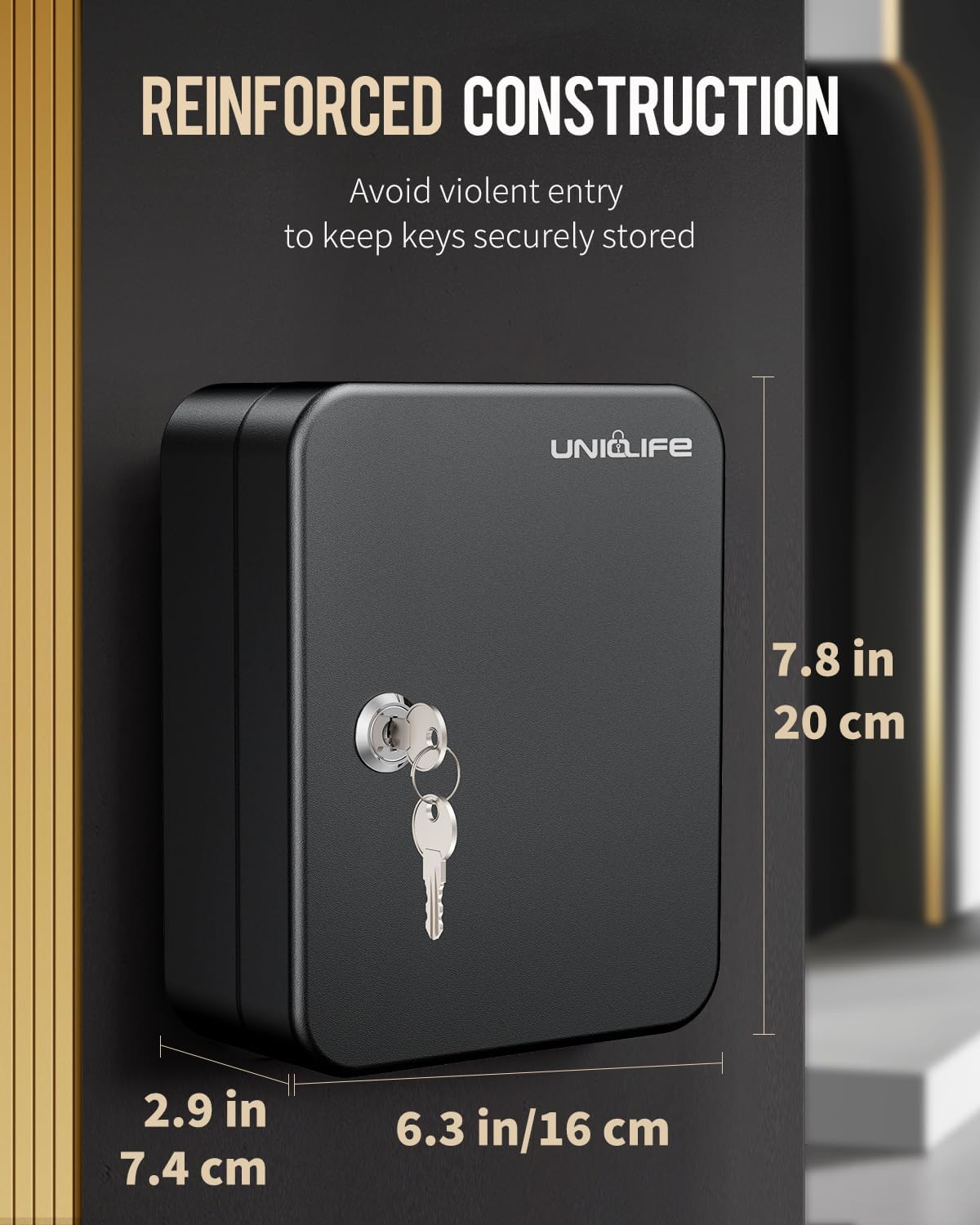• Secure Construction: 6.3" L x 2.9" W x 7.8" H. Made of 1 mm scratch-proof frosted steel sheet for optimal security. And the solid piano hinge makes it unlikely to be broken to avoid forced entry.