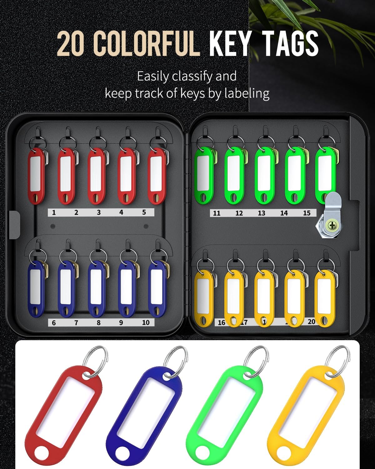 • 20 Tags in 4 Colors: Each flexible key tag contains a removable blank paper for labeling. And its transparent window allows you to identify items at a glance.