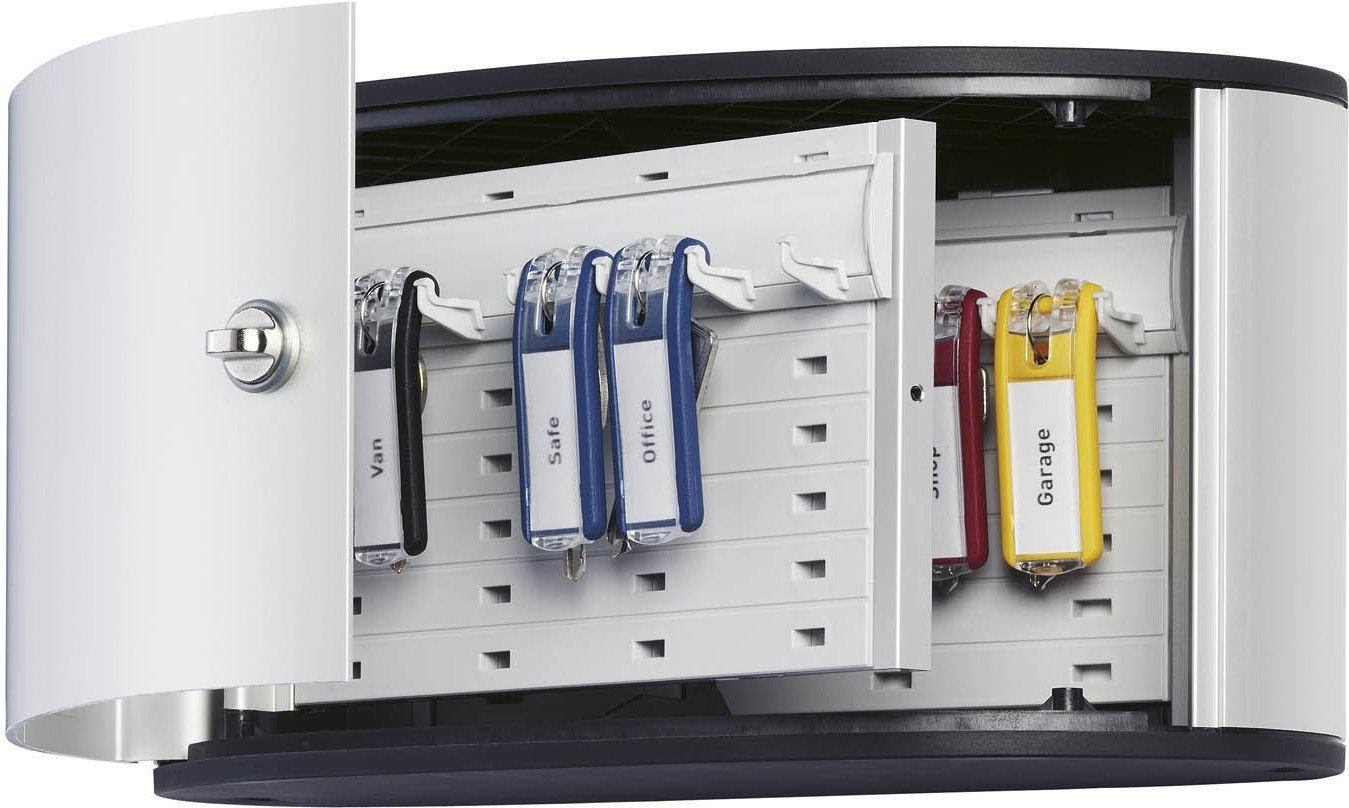 DURABLE has created and produced a vast range of innovative, solution-designed office organization products for more than 80 years. Their high-quality standards enable them to produce outstanding consumer items that are built to last. The DURABLE Key Box is made of brushed aluminum and compliments any décor. This 12 key tag capacity box comes with a starter set of 6 key tags which include 2 black, 2 dark blue, 1 red, and 1 yellow. The key tags have an extra-large snap-open label window with a patented key ring shaft. In addition, the key tag label can be easily exchanged without removing the key ring. Inside the key box, the key rails are height adjustable to the length of the key while a key control sheet on the inside of the box door helps to keep track of all keys.