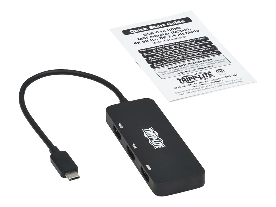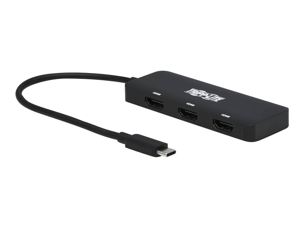 By connecting the USB-C adapter to a source that supports DisplayPort Single-Stream Transport (SST) or Multi-Stream Transport (MST) mode, you may connect up to three displays simultaneously. This allows you to display the same image on all monitors, extend your host desktop across all with different windows open on each, or combine all into one large display as a video wall.