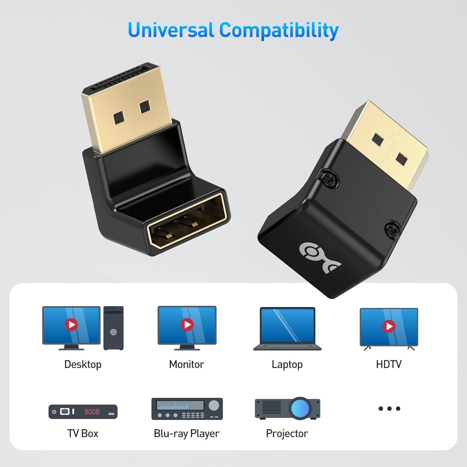 • Advanced DisplayPort 1.4 Support: Each right-angle Displayport adapter supports the latest DisplayPort 1.4 features, enabling resolutions up to 8K@60Hz and 4K@240Hz. Ideal for gaming, these adapters support Auto Low Latency Mode (ALLM), Variable Refresh Rate (VRR), and high-definition audio including Dolby TrueHD and Dolby Atmos.