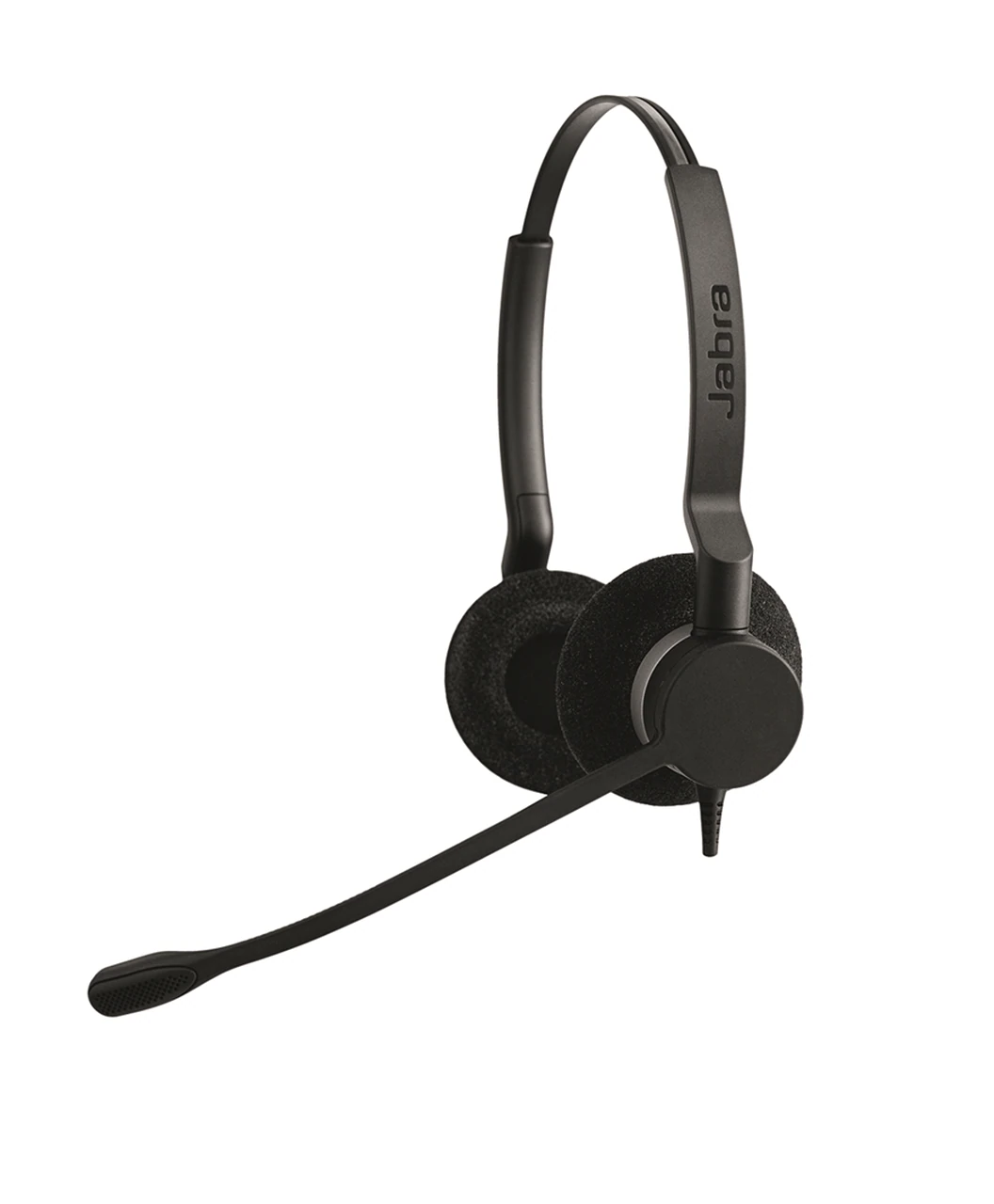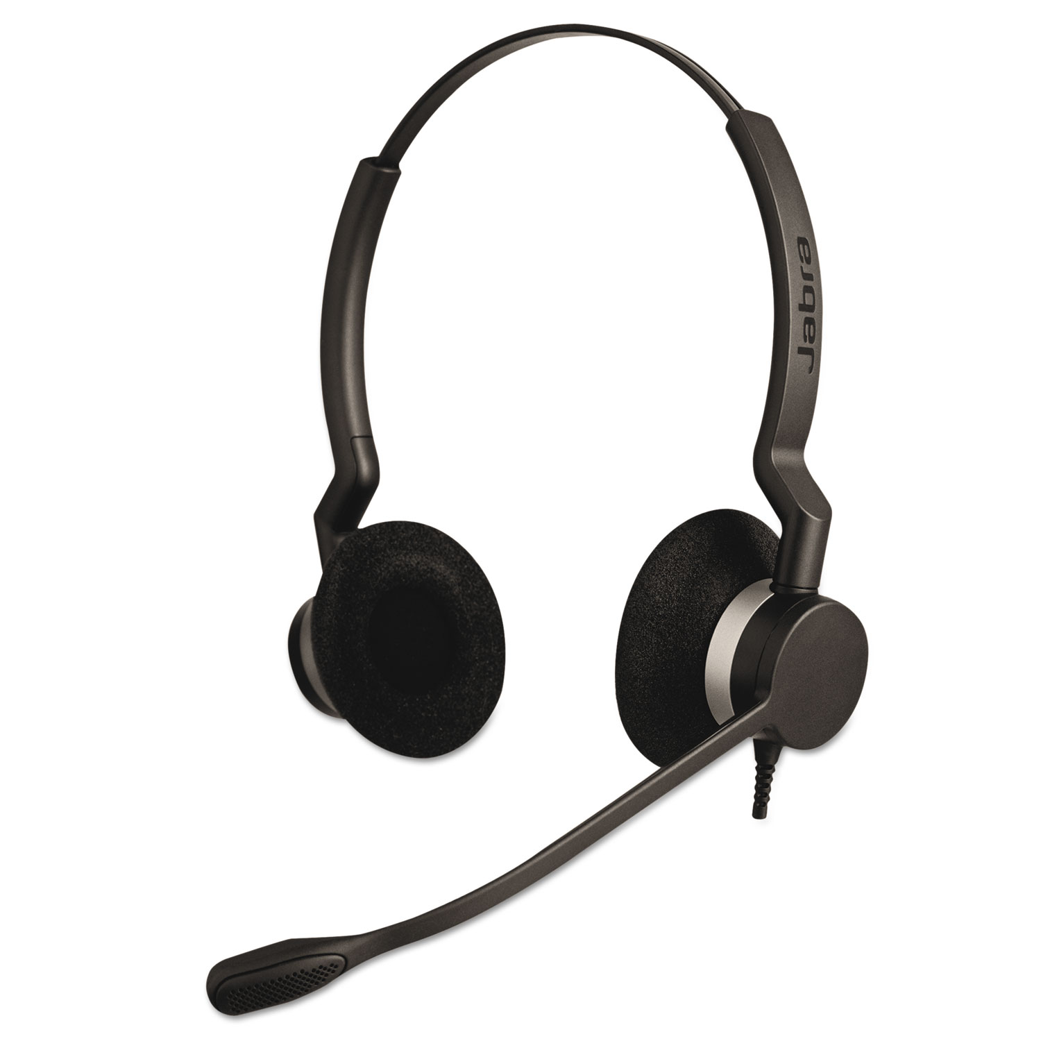 Provide your contact center agents with a lightweight, durable headset that delivers HD Voice/Wideband speaker performance and noise cancellation with the BIZ 2300 QD Duo Headset from Jabra. Worn over one's head, this headset is compatible with traditional desk phones and features dual stereo speakers. It's also capable of Quick Disconnect (QD) when used with an additional cord. Additionally, the Wideband/HD Voice frequency response helps enable realistic reproduction of human voices on optimized digital telephony lines. The Jabra 2300 also features a noise cancelling microphone with standard vocal sensitivity, a swiveling, flexible boom arm for adjusting the position of the microphone, and foam earpiece cushions.