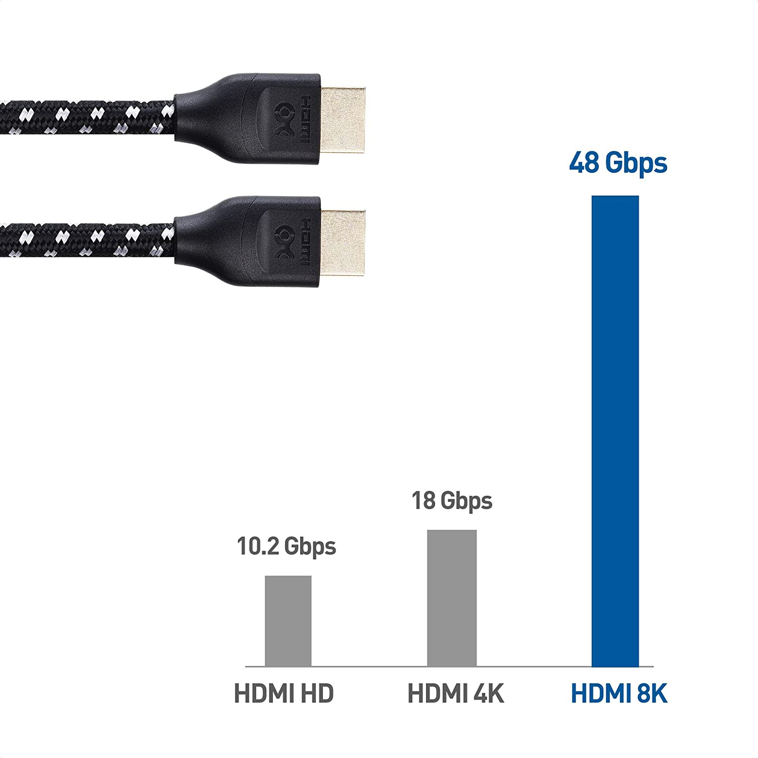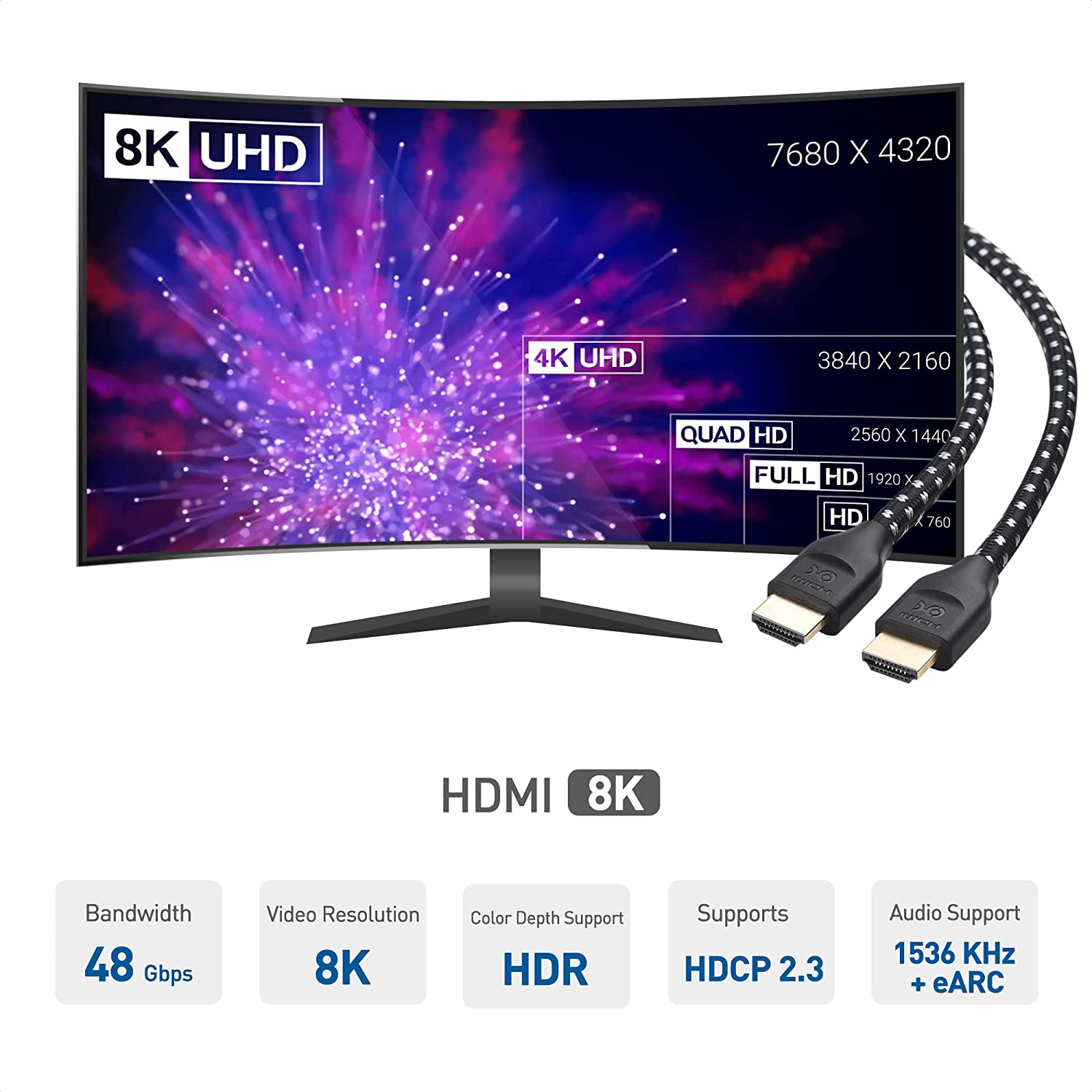- 8K HDMI CABLE supports high bandwidth HDR with a 48 Gbps bandwidth as specified in HDMI 2.1 standard; The 8K HDMI cord offers more than 2x the HDMI 2 and HDMI 2.0b bandwidth of existing 4K HDMI cable and HDMI 4K Ultra HD cable; HDCP 2.2 HDMI cable supports a 21:9 cinema aspect ratio, HDCP 2.2, 32 audio channels and a 1536 KHz sampling rate
