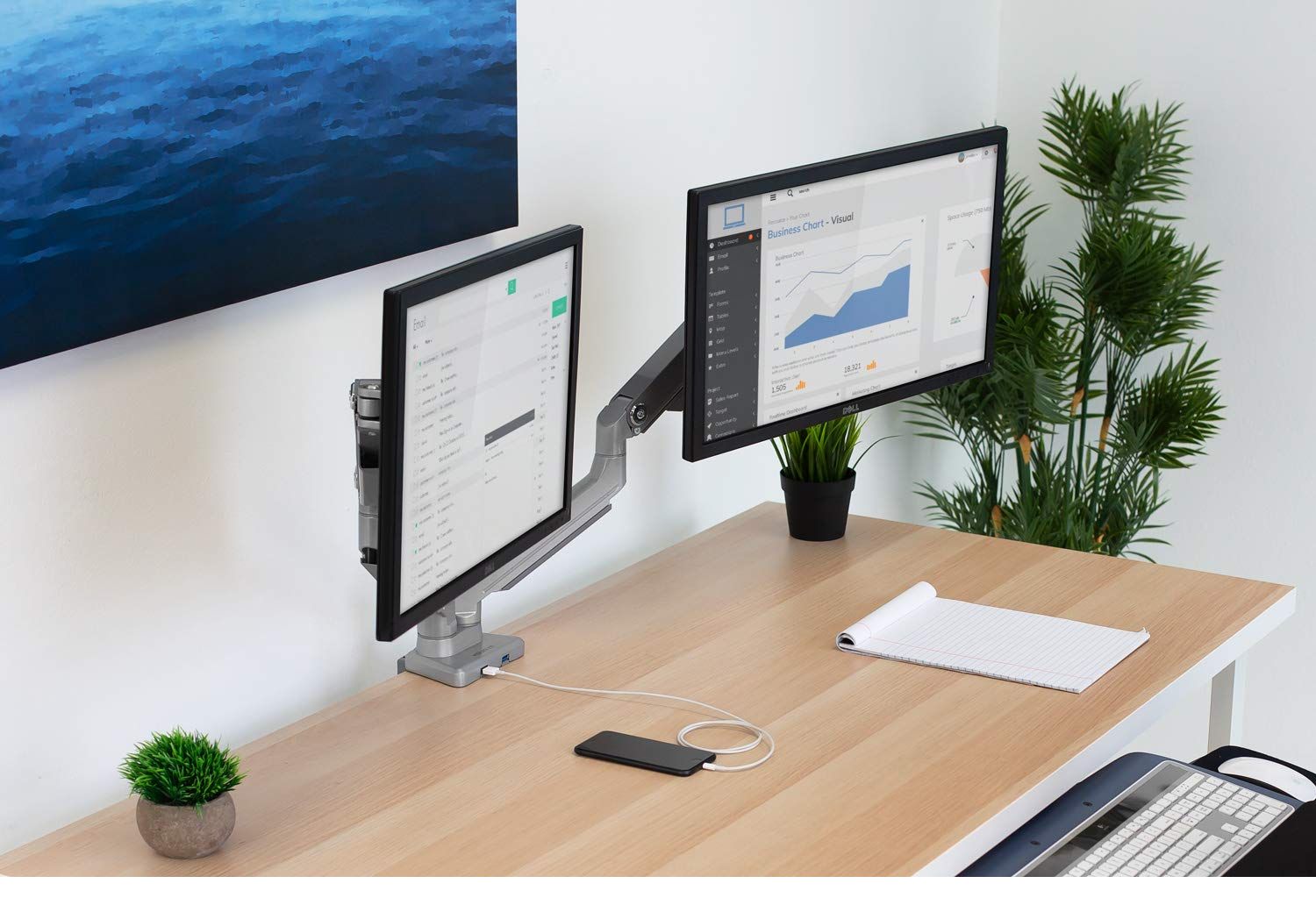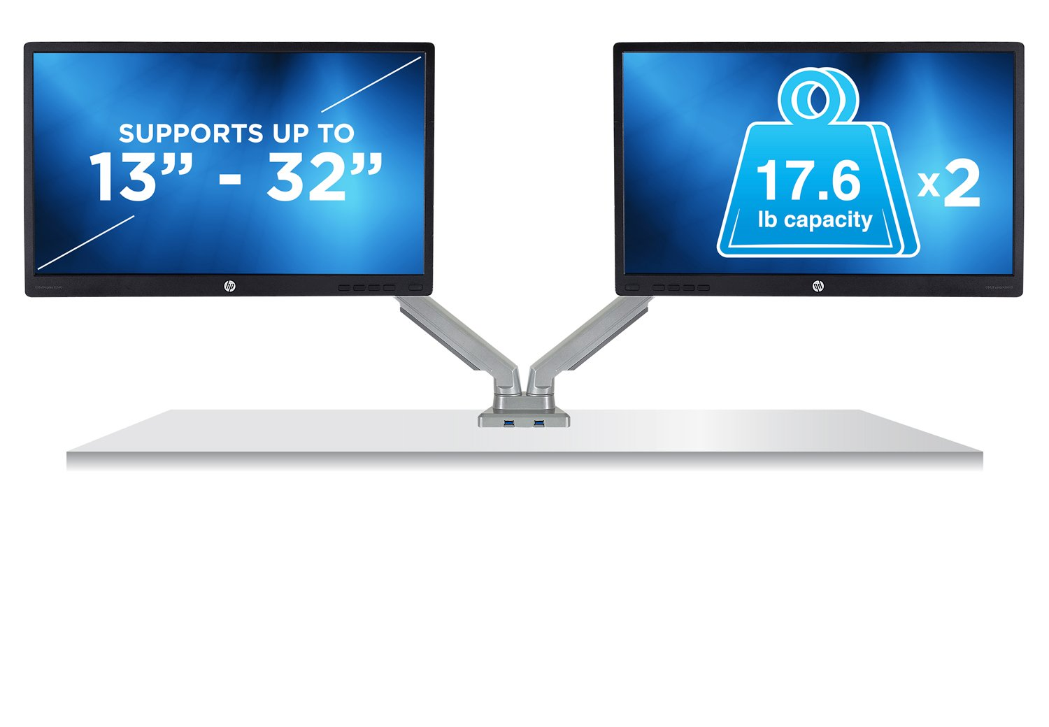 - FEATURES: Dual monitor arm has counterbalanced, mechanical spring arms which are easily height adjusted and comes with 2 x USB 3.0 ports and (1) USB extension cable. It has integrated cable management and is made out of heavy duty steel and aluminum alloy.