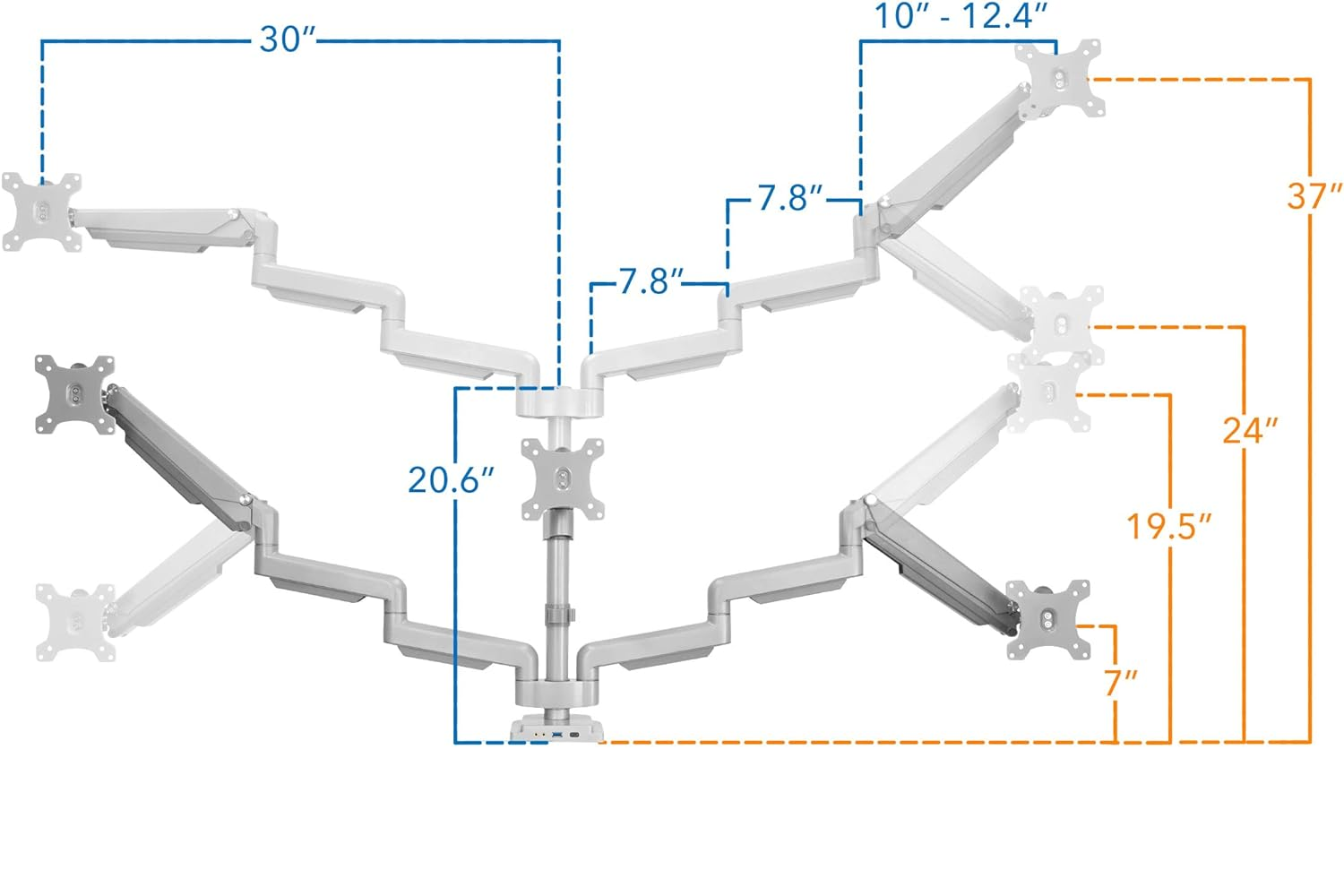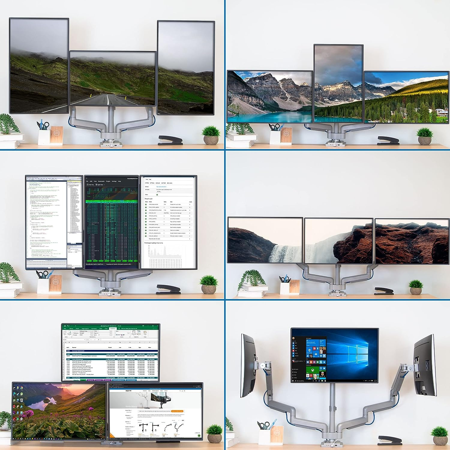 - FULLY ADJUSTABLE: Three monitor stand outer arms can tilt up and down 90 degrees, swivel 360 degrees left and right, raise and lower, and monitors can be rotated and placed in portrait or landscape orientation independent of one another. TURN HEX BOLT ON TOP OF OUTER ARMS TO ADJUST THE GAS SPRING TENSION TO HOLD SCREENS IN PLACE (SEE VIDEO FOR DETAILS). Center monitor can be height adjusted with a tool-free turn of the mounting bracket arm.