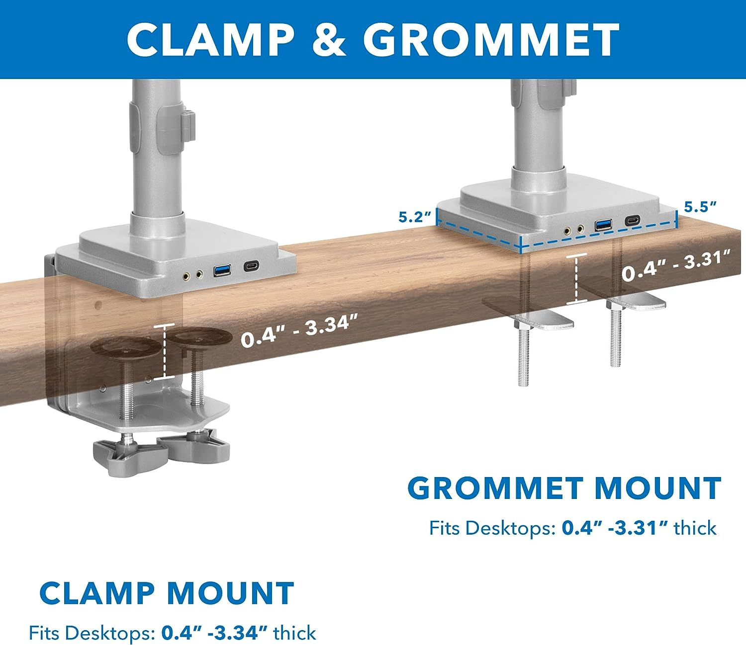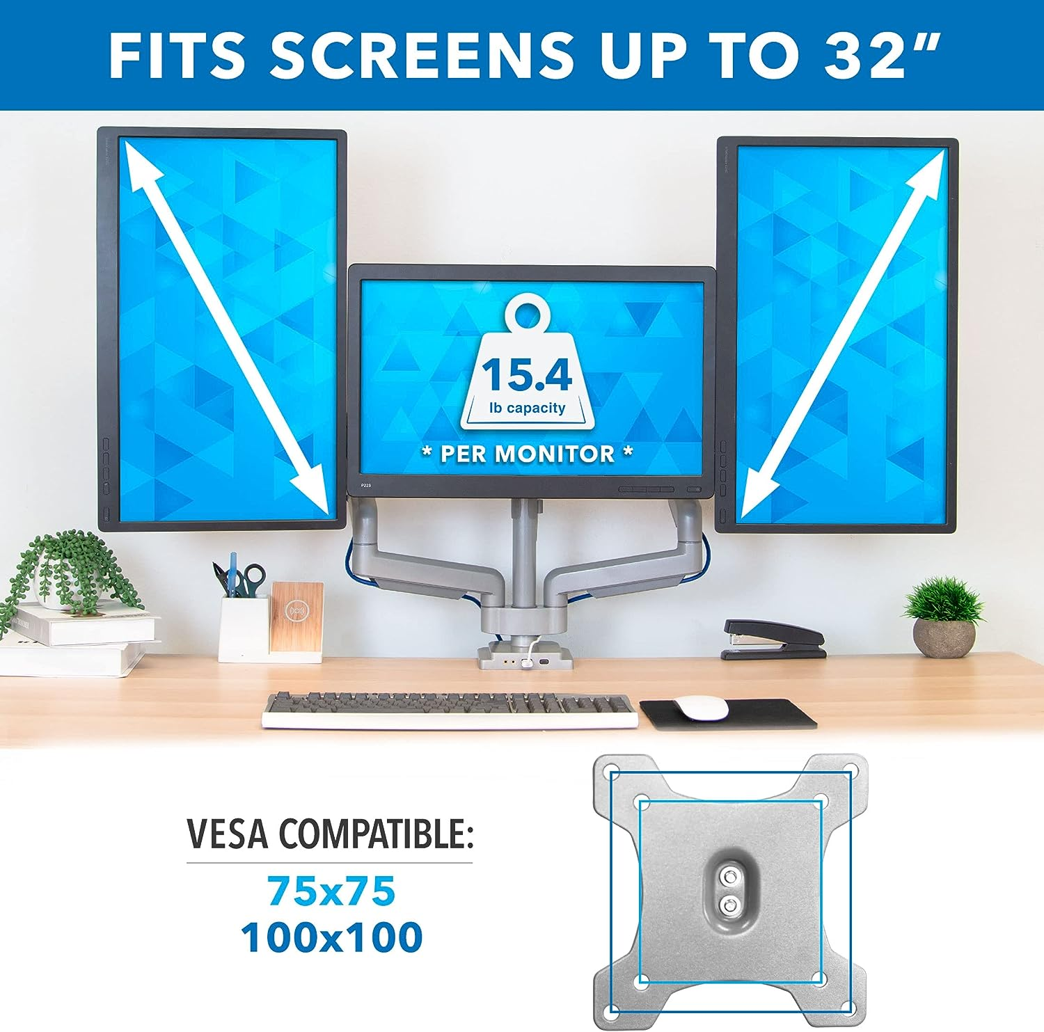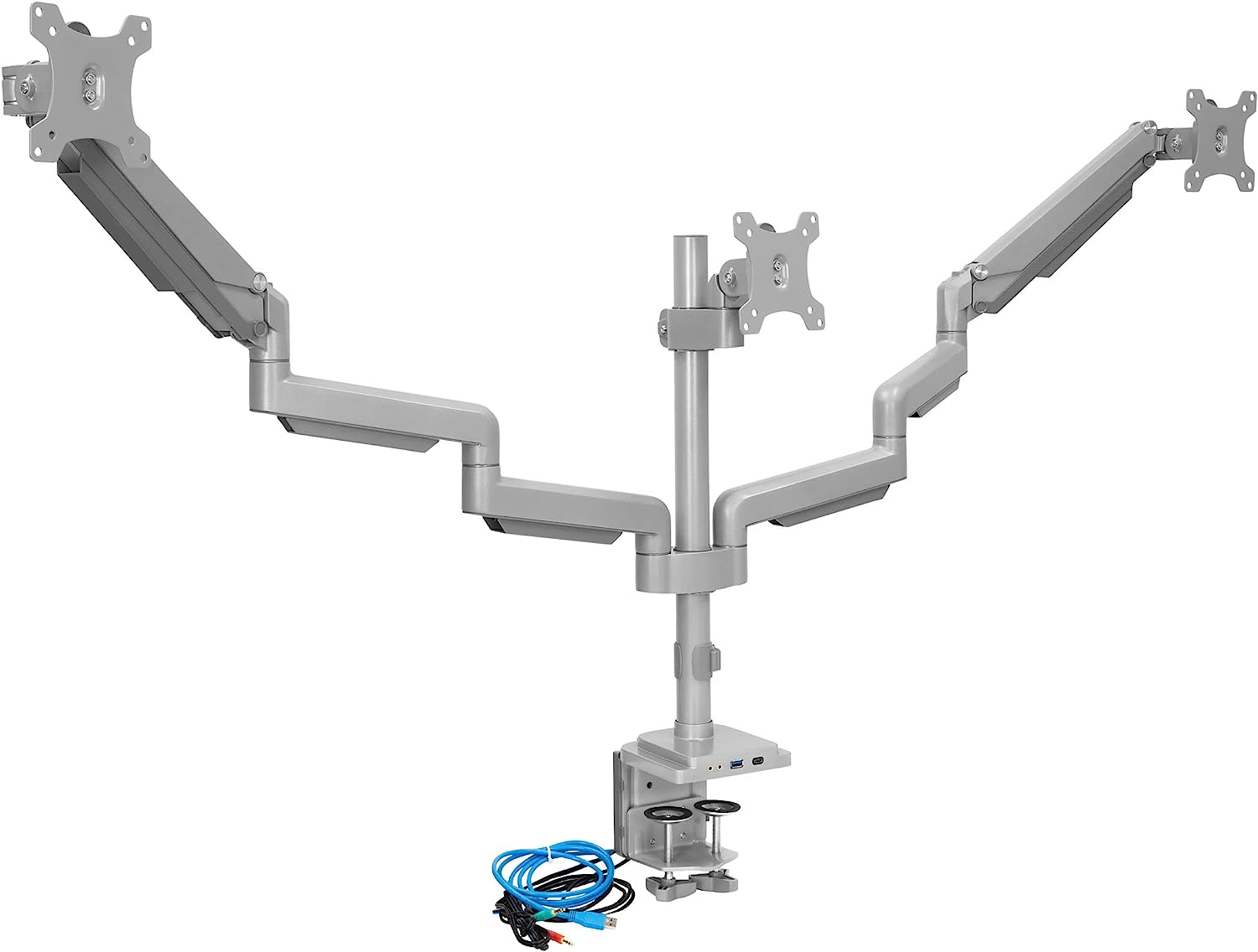 - FEATURES: Triple monitor stand has counter-balanced gas spring arms for effortless adjustments and features (1) USB 3.0 port, (1) audio port and matching extension cables for each. Has integrated cable management to keep your cords out of sight and is made out of heavy duty steel and aluminum alloy. Comes with interchangeable C-clamp and grommet base mounts for desktops up to 4 inches wide.