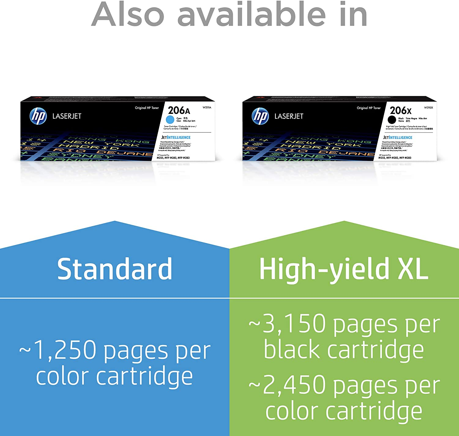 - HP 206A toner cartridges work with: HP Color LaserJet Pro M255dw, M283fdw, M283cdw