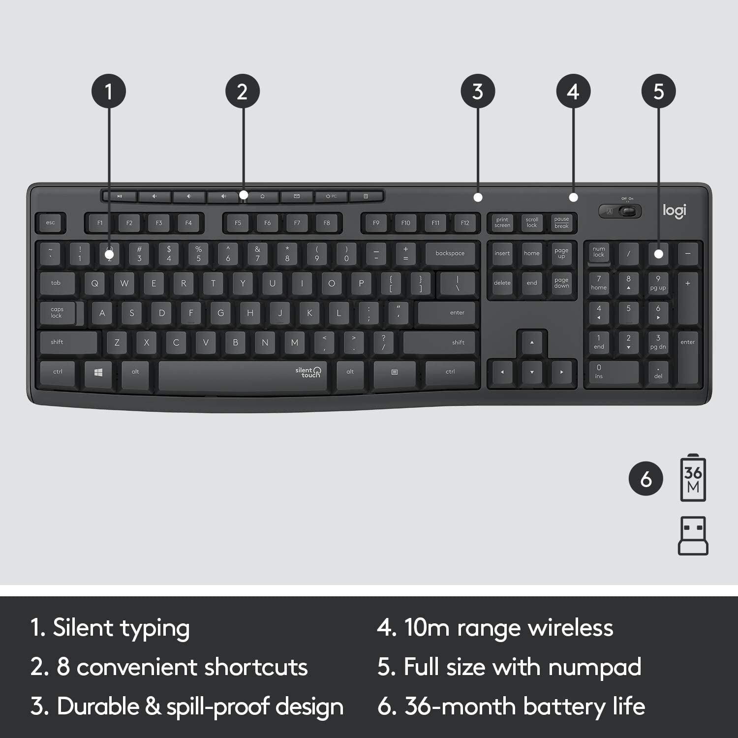 Logitech MK295 Wireless Keyboard and Mouse Combo with SilentTouch Technology, Full Numpad, Advanced Optical Tracking, Lag-Free Wireless, 90% Less Noise, Graphite
