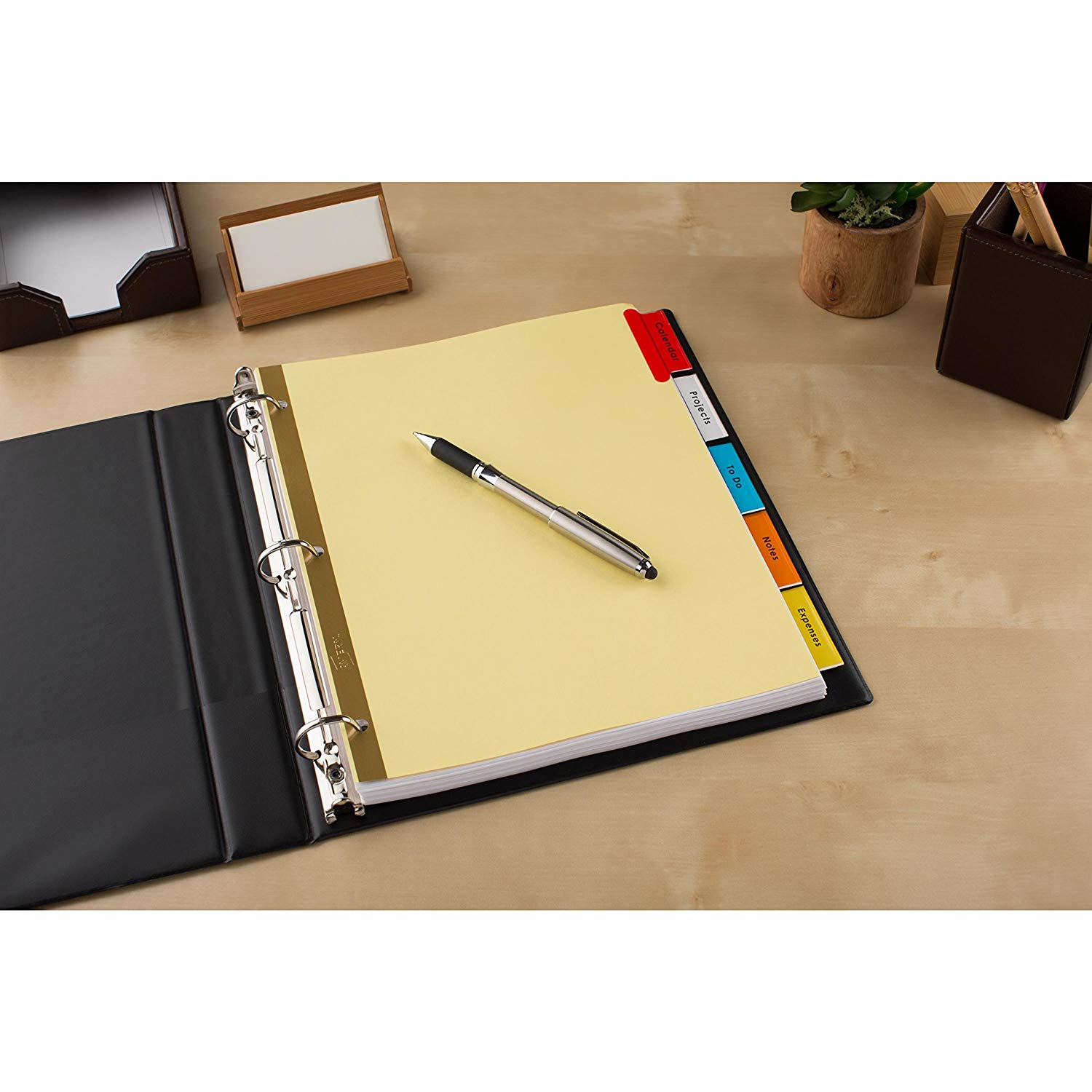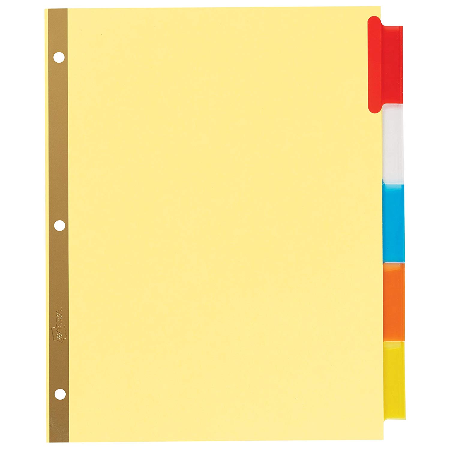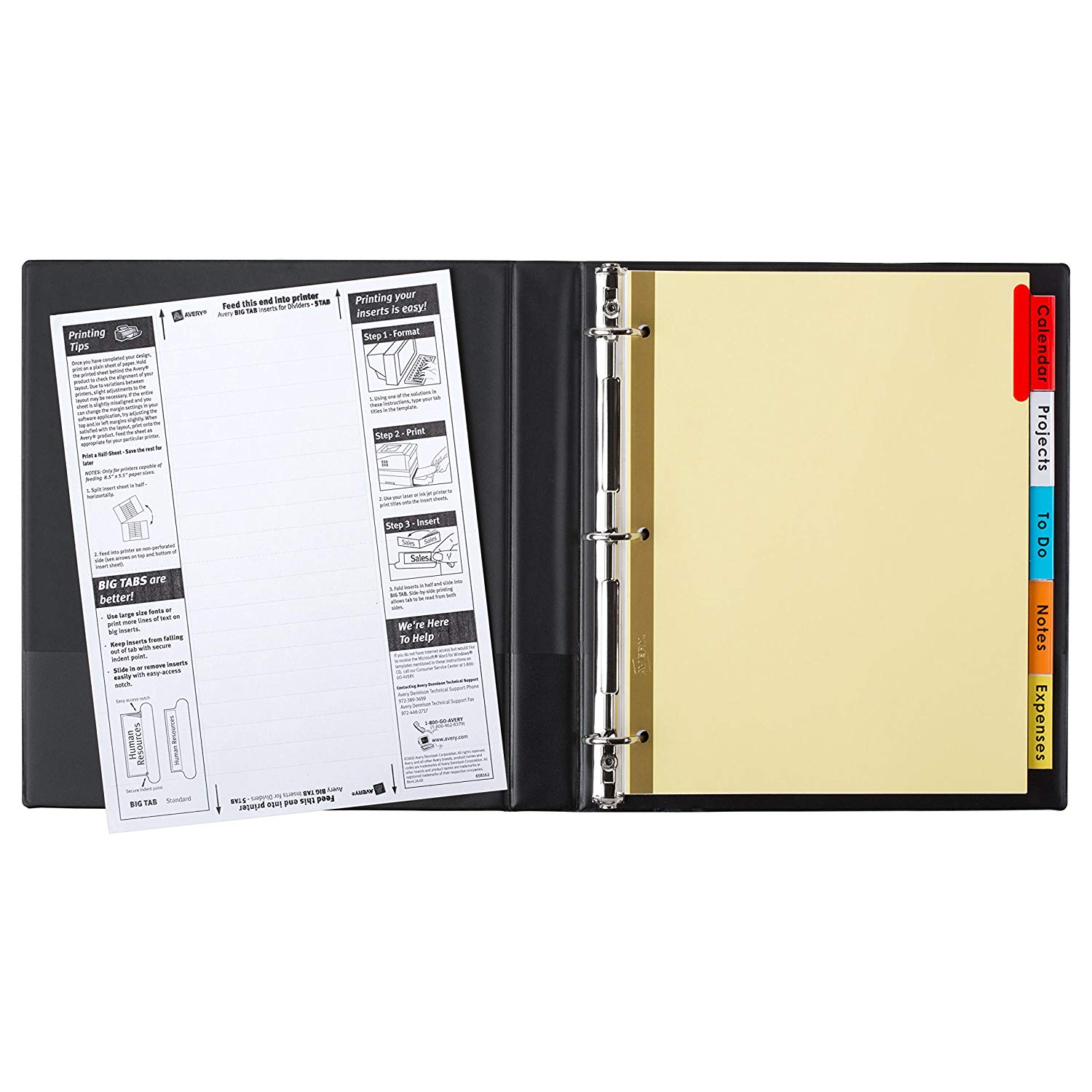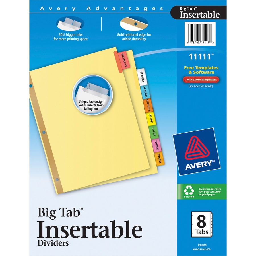 Avery AVE23284 Big Tab Reinforced Dividers, Multicolor - 8 Tabs Write on laminated tab with pen or pencil, erase, and write again! Gold line reinforcing strip for tear resistance at binder holes. Three-hole punched for use in standard ring binders