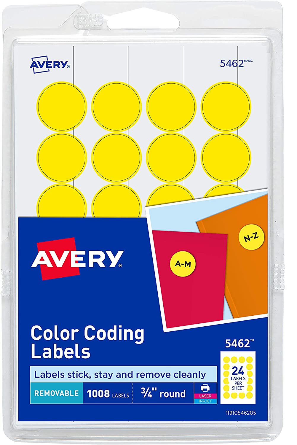 Avery Print/Write Self-Adhesive Removable Labels, 0.75 Inch Diameter, Yellow, 1,008 per Pack (5462)