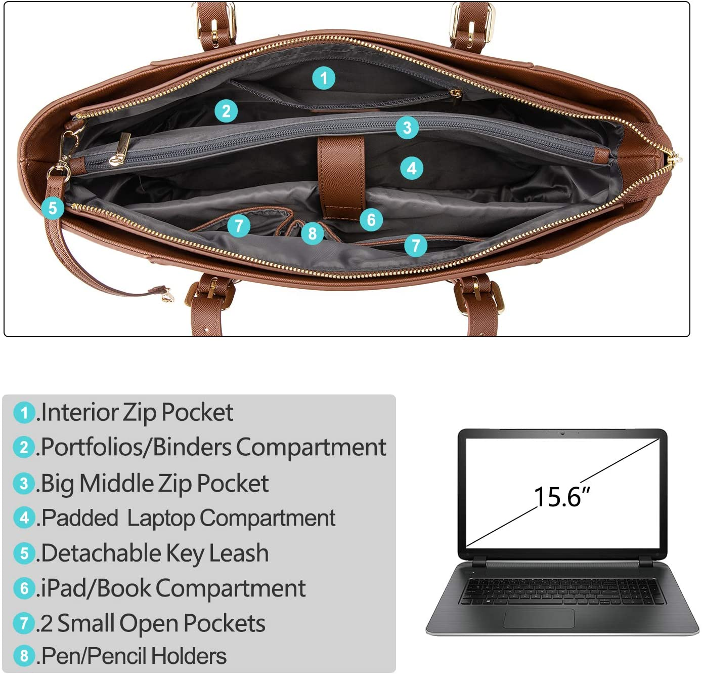 - Roomy, multi-pockets and organized, 3 main compartments (One was padded for laptop), 1 big middle zip pocket, 2 open pockets, 1 inner zip pocket, 1 back zip pocket, 1 key string, it still has a lot of space after loaded a laptop