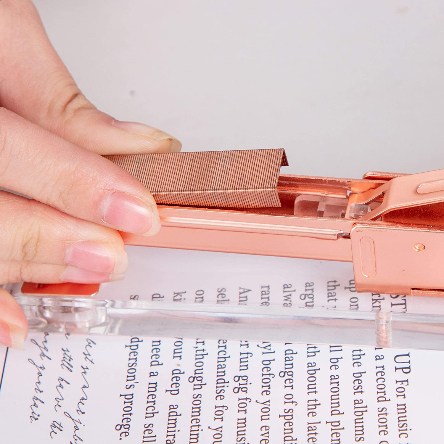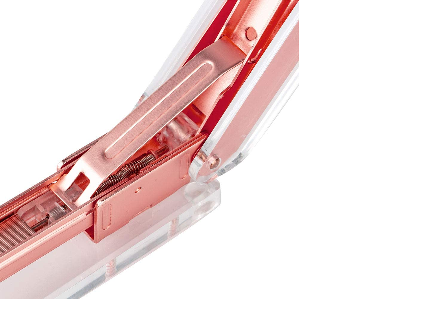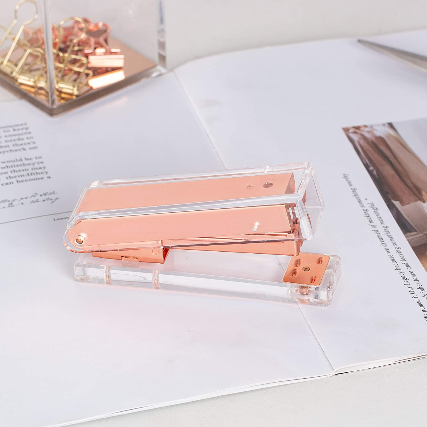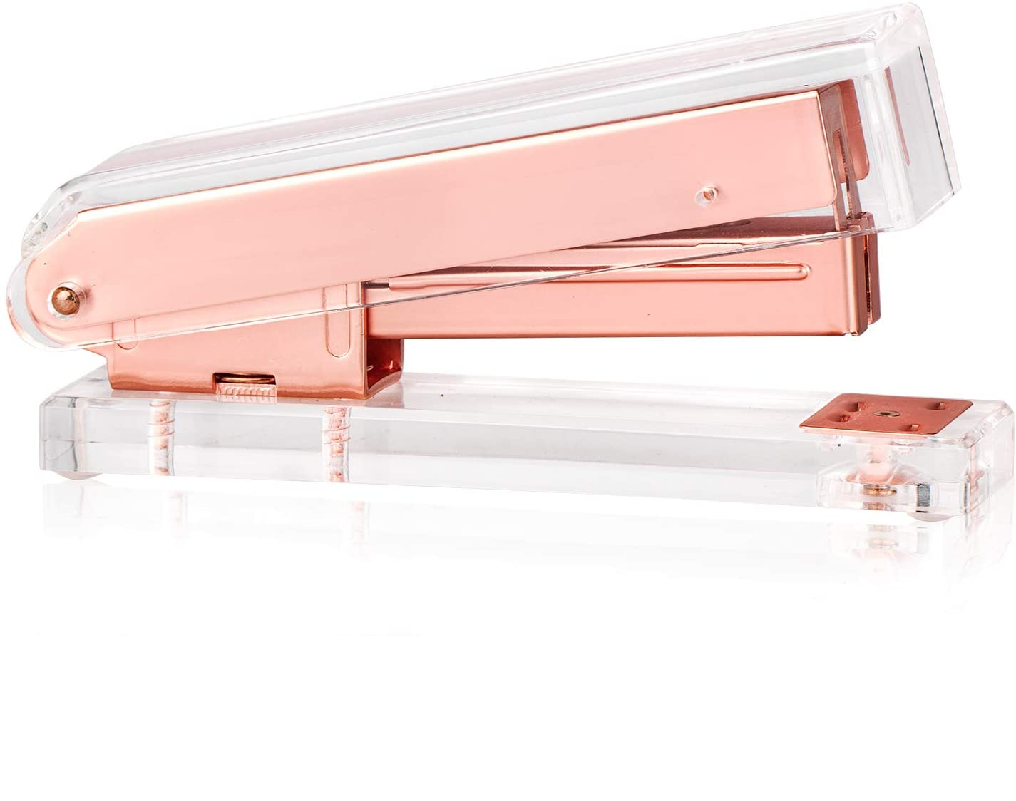 - BRIGHTEN UP YOUR DESK - This beautiful stapler is truly unique for any office supplies and stationery. It has luxury rose gold metal front and ultra transparent clear acrylic body with smooth polished edges. It is visually gorgeous and guaranteed to enhance your office and home workspace.