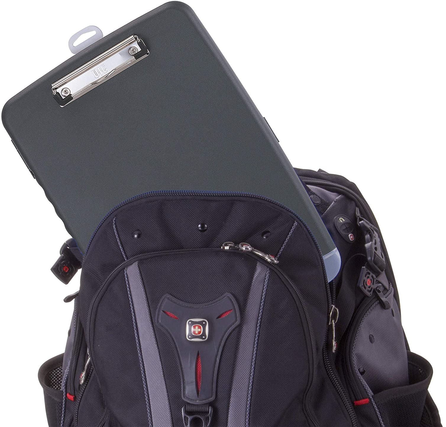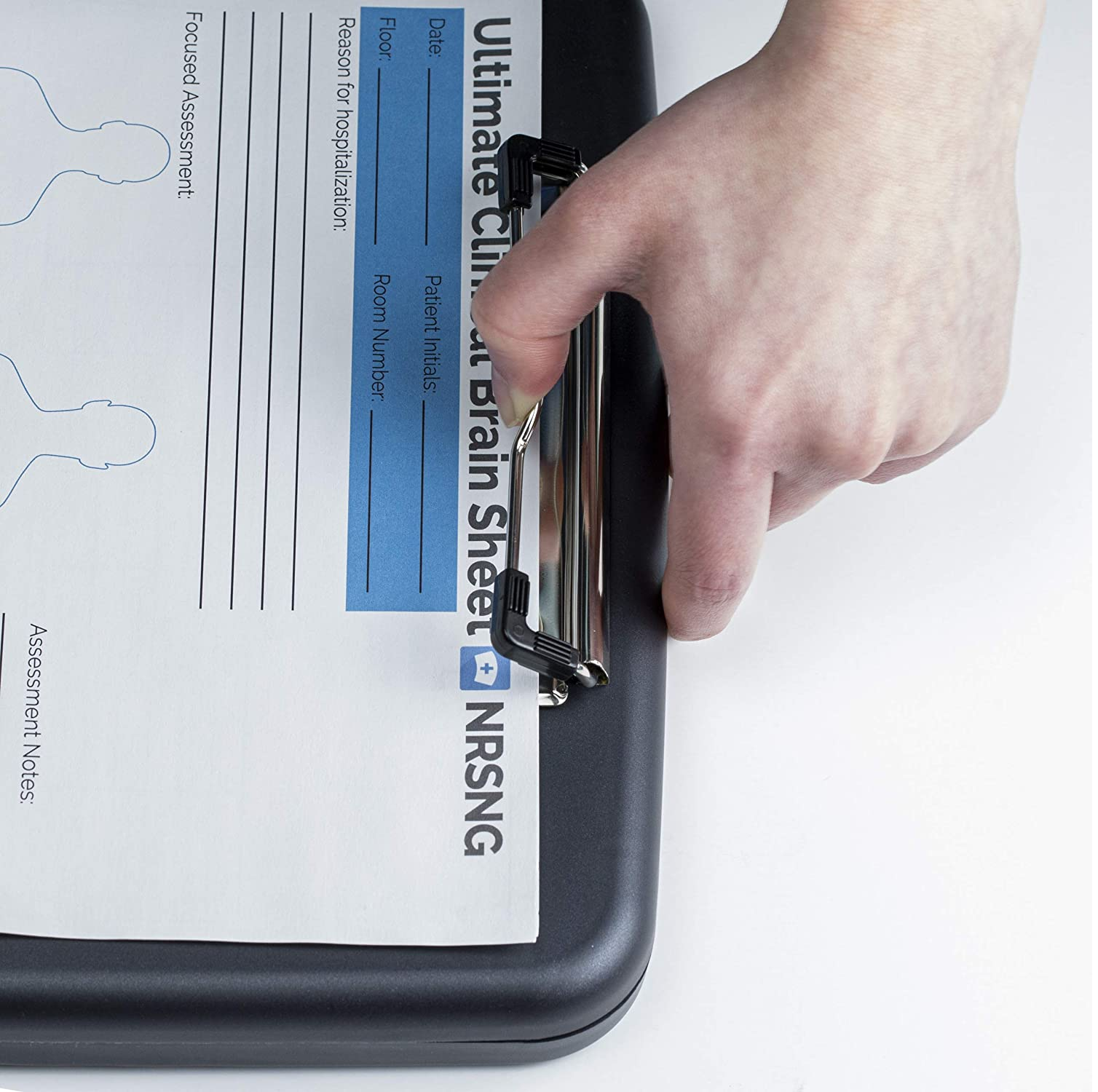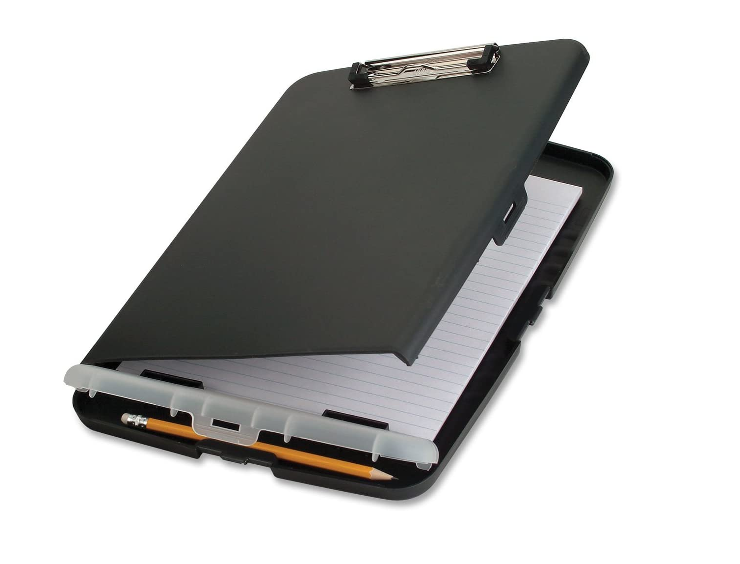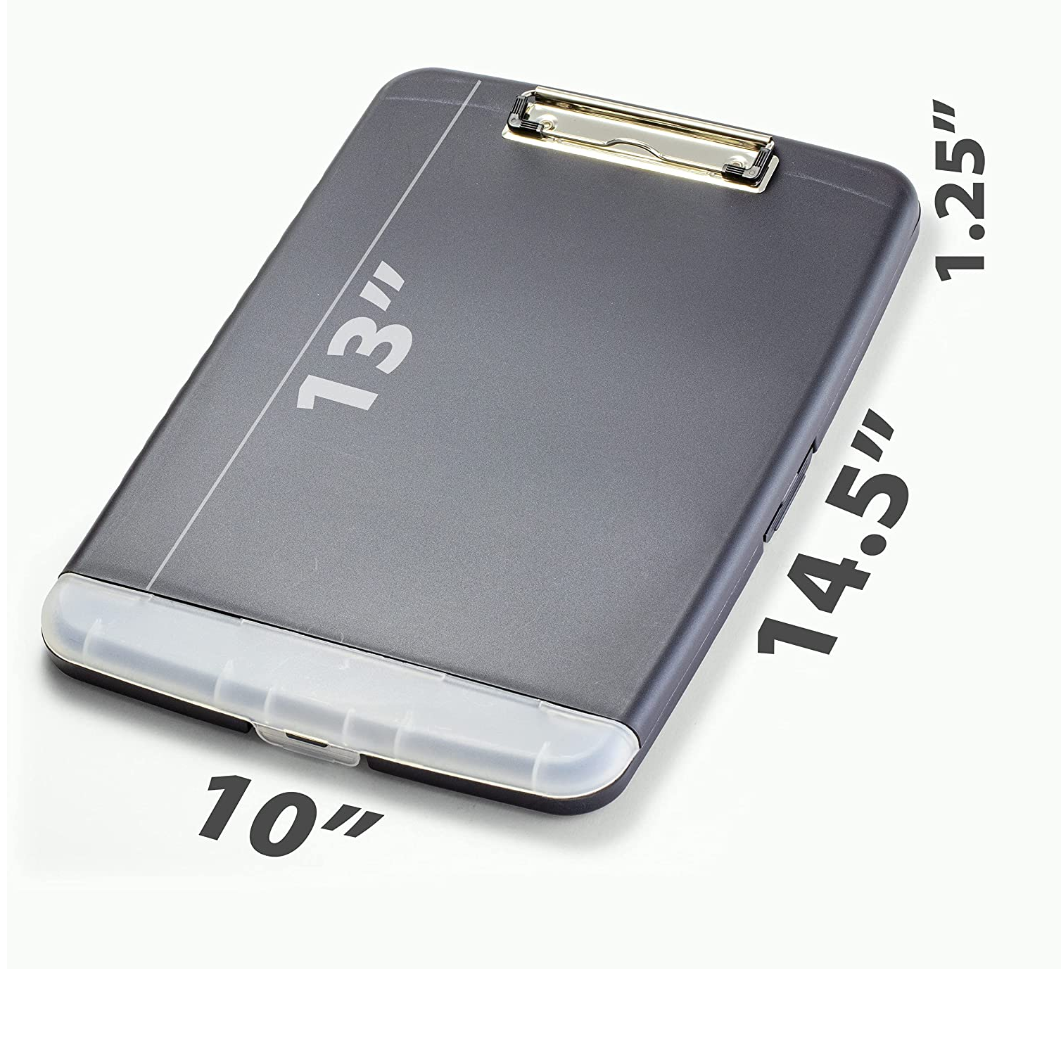 - Slim storage clipboard includes a low-profile clip with ergonomic finger grips; clasp closure
