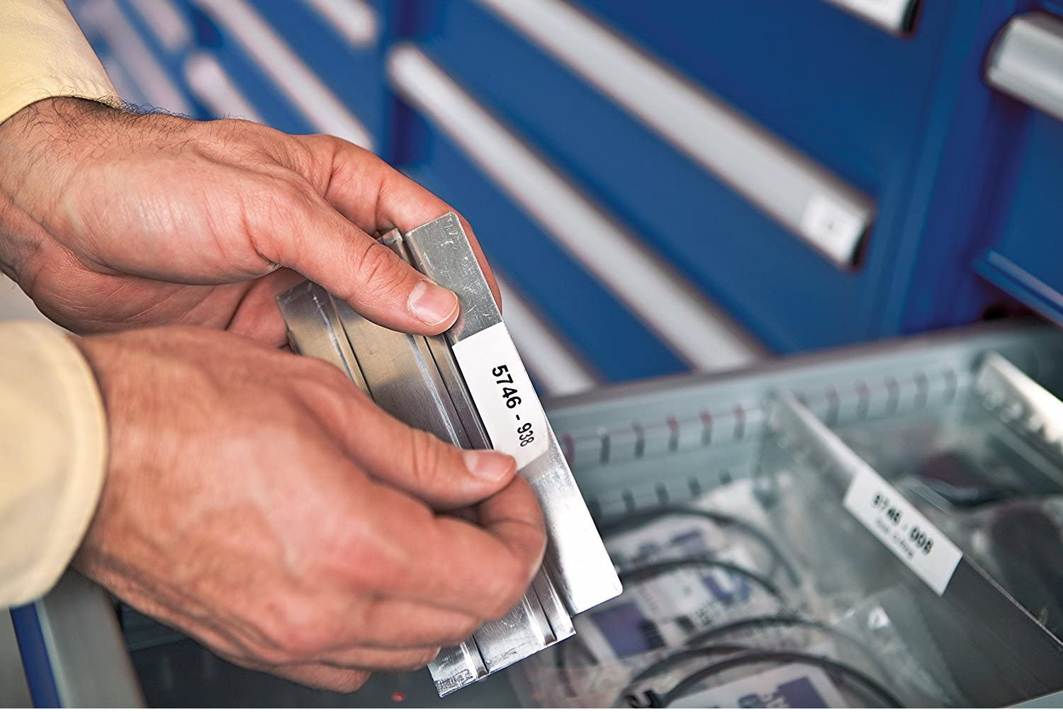 - Includes: 0.75" white IND vinyl label cartridge, 0.38" white IND vinyl label cartridge, AC adapter, carrying case, and rechargeable lithium-ion battery