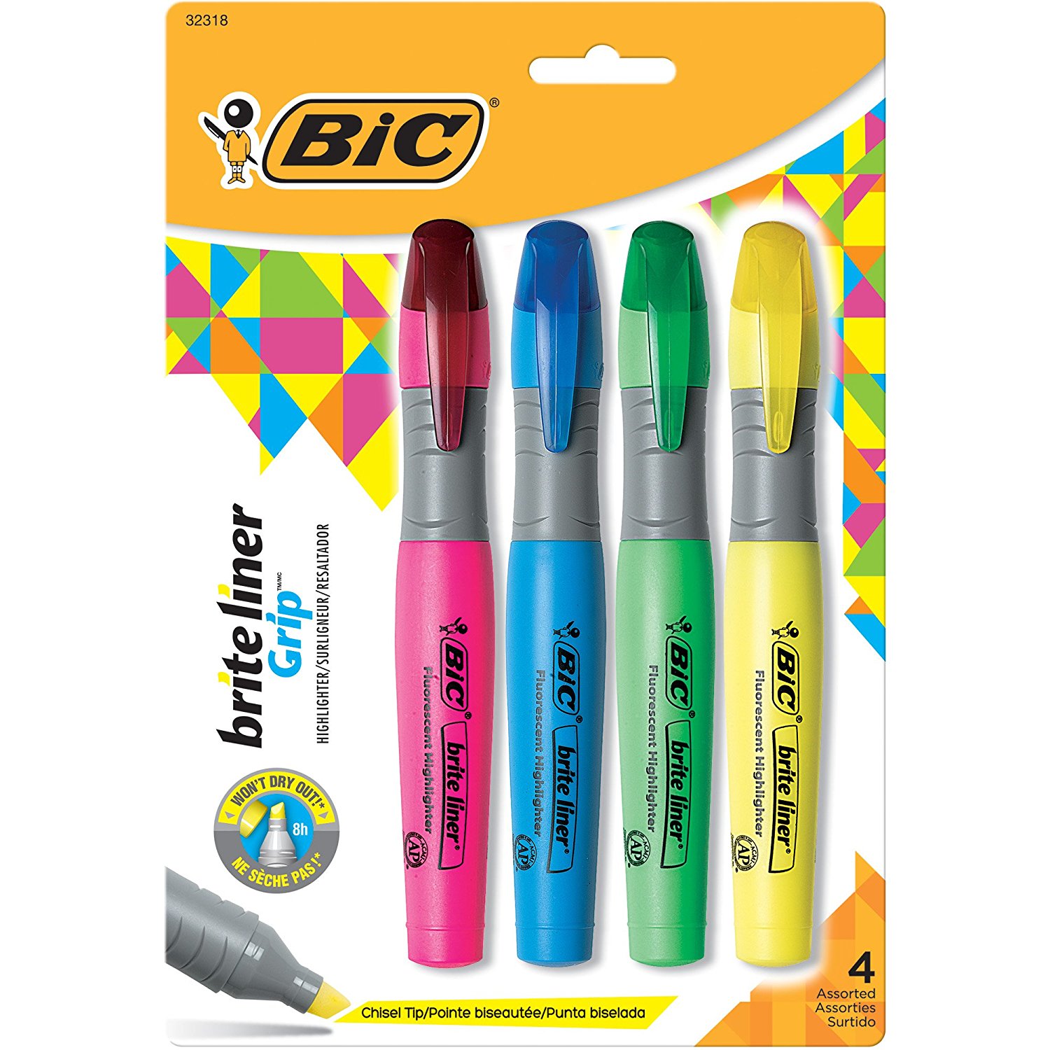 Bic Brite Liner Highlighter with Rubber Grip, Chisel Tip, Assorted