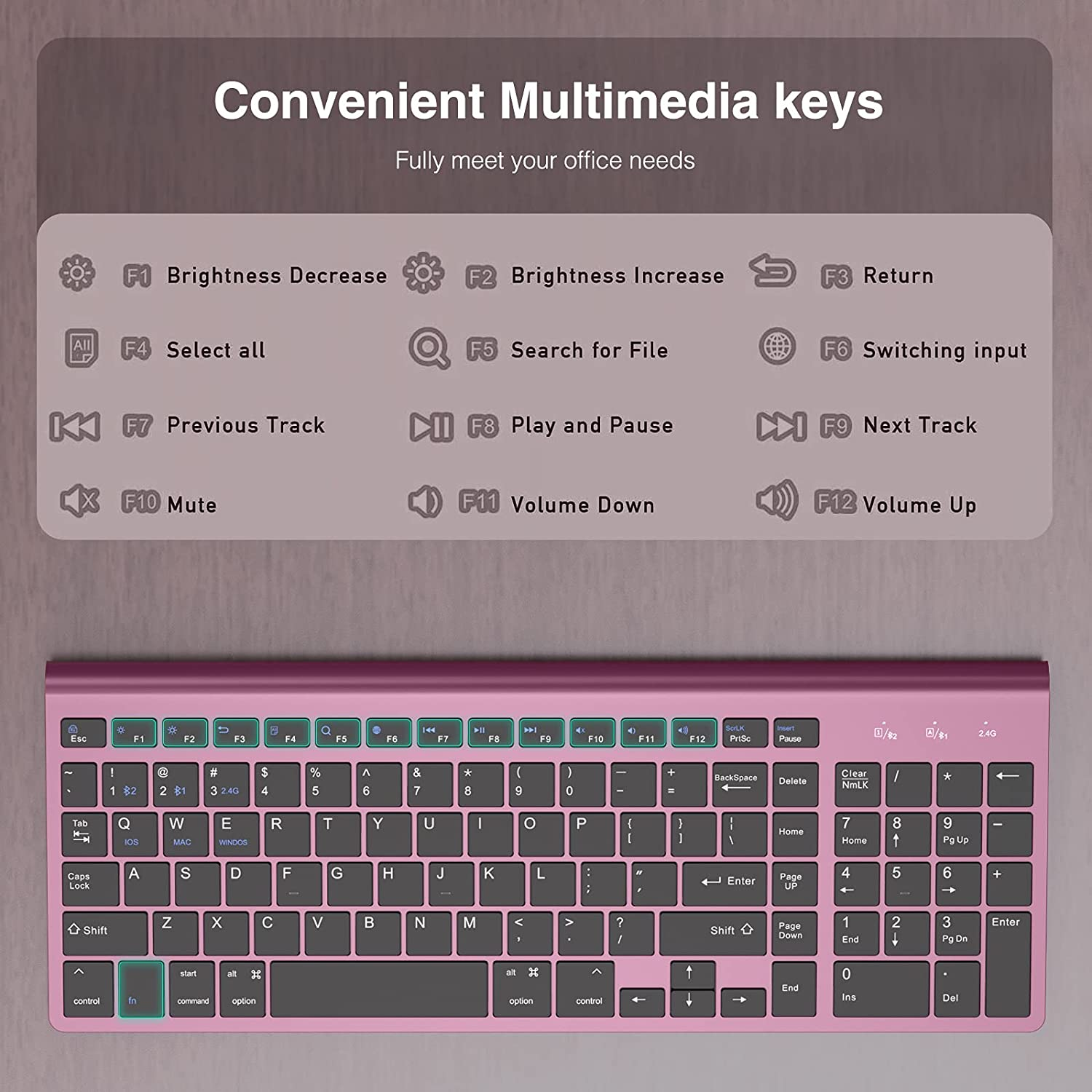 - Multi-Device Wireless keyboard: Support two connection methods: 2.4G and Bluetooth(BT3.0+BT5.0) It has the function of connecting devices with Android, Windows, and Mac systems at the same time. It could keep stablely connecting on different devices and easy to switch.