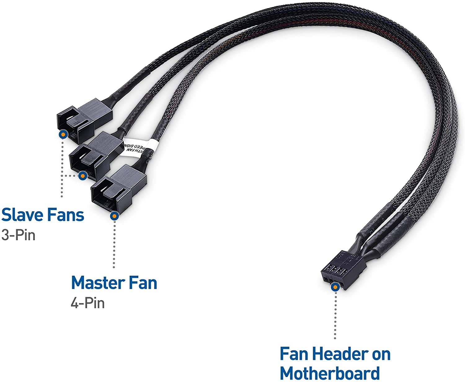 • 4-PENS VENTILATOR SPLITTER CABLE connects 3 computer case fans to one single mainboard fan header; PWM splitter cable connects an additional fan to increase airflow into your computer case; Fan speed label on the fan fan fan master connector is wired to receive the PWM control signal and this to share with de Slave ventilators