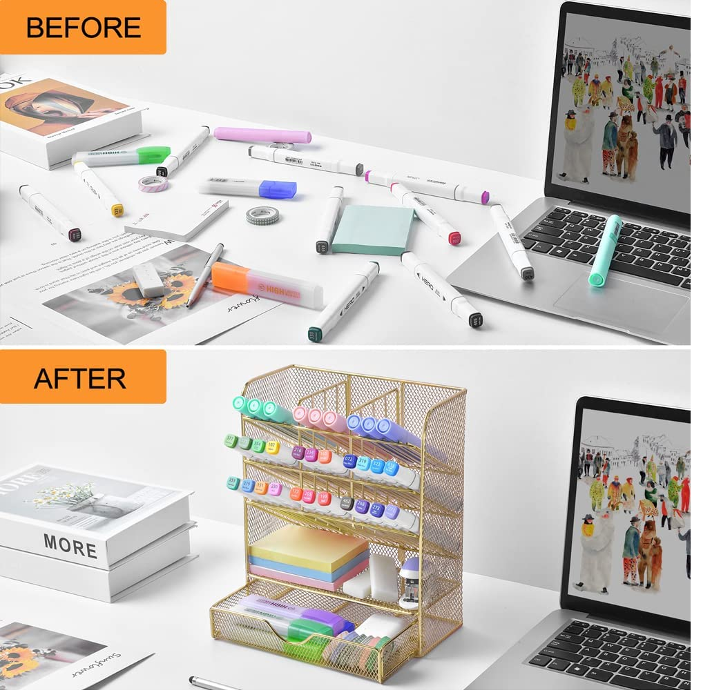 Spacrea Mesh Pen Organizer - Pencil Holder for Desk, Desk Organizer with Drawer for School, Home, Art Supplies (Gold)