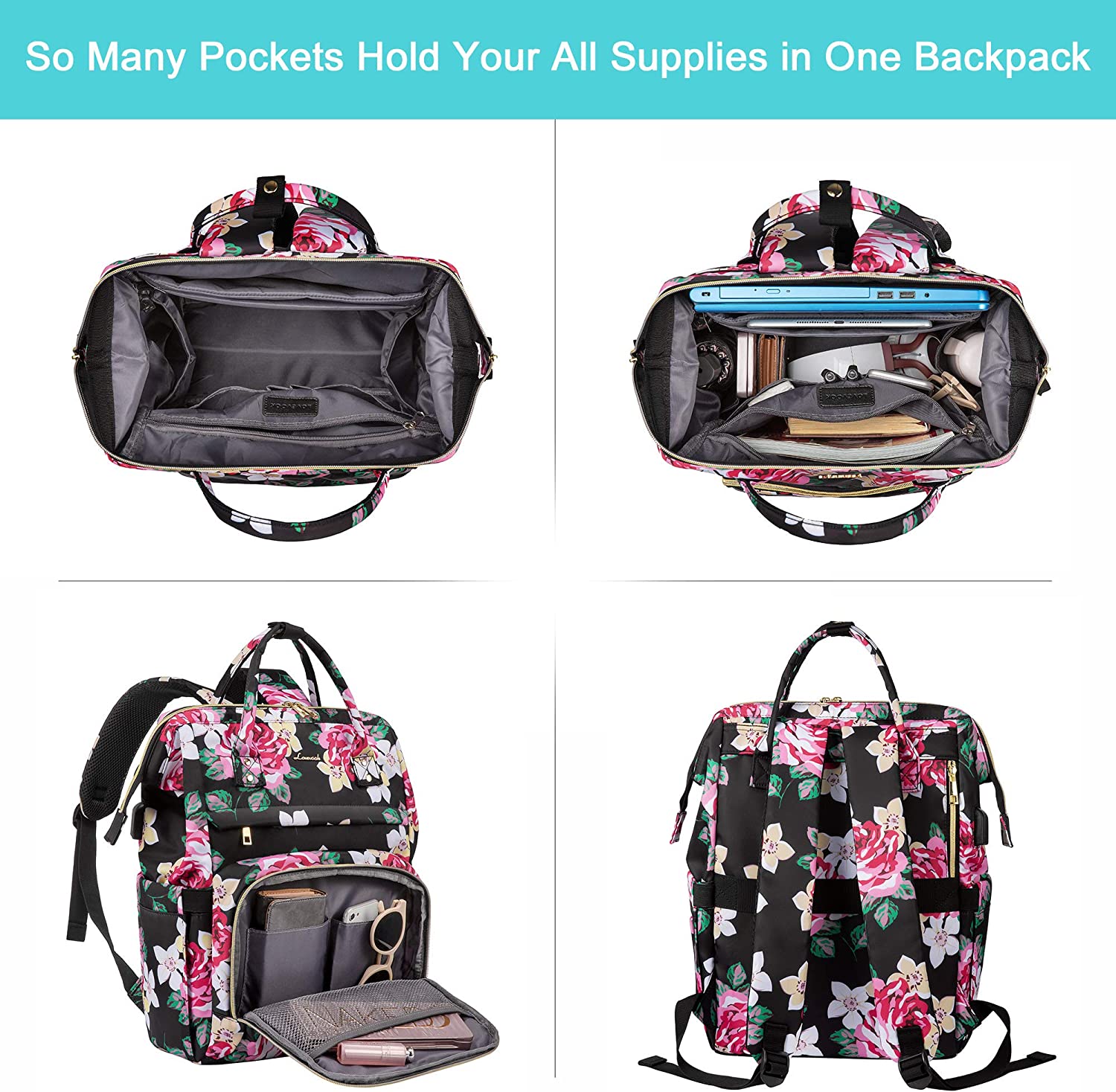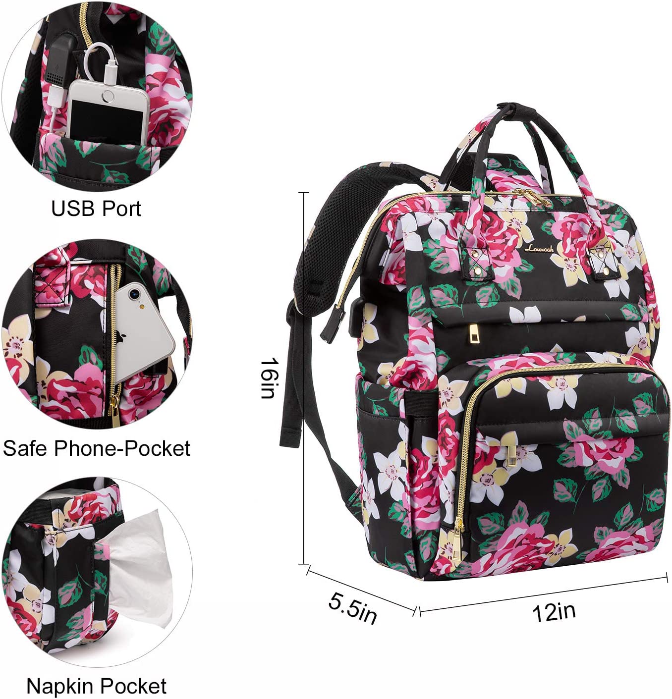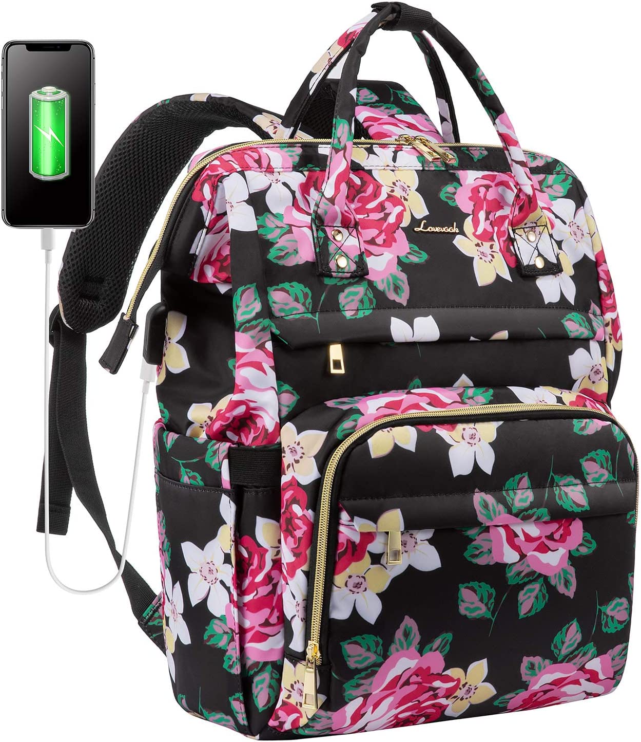 LOVEVOOK Laptop Backpack 15.6 Inch with USB Charging Port - Floral