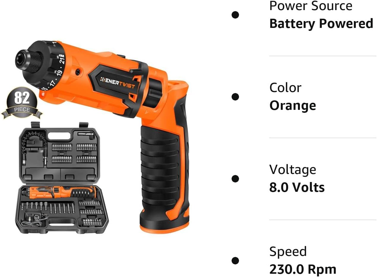 - 【Gift 82-Pieces Accessories & Portable Case & 2-Years Quality Promise】What You Get: (1) Enertwist 8-Volt power screwdriver, (1)flexible extension shaft, (68) 25mm bits, (6) 50mm bits, (6) nut drivers, (1) magnetic bit holder, (1) 60-minute Fast Charger, (1) Tool Case. Enertwist offers a 2-Years Quality Service for ET-CS-8 battery screwdriver, Please feel free to contact us if you have any of the questions.