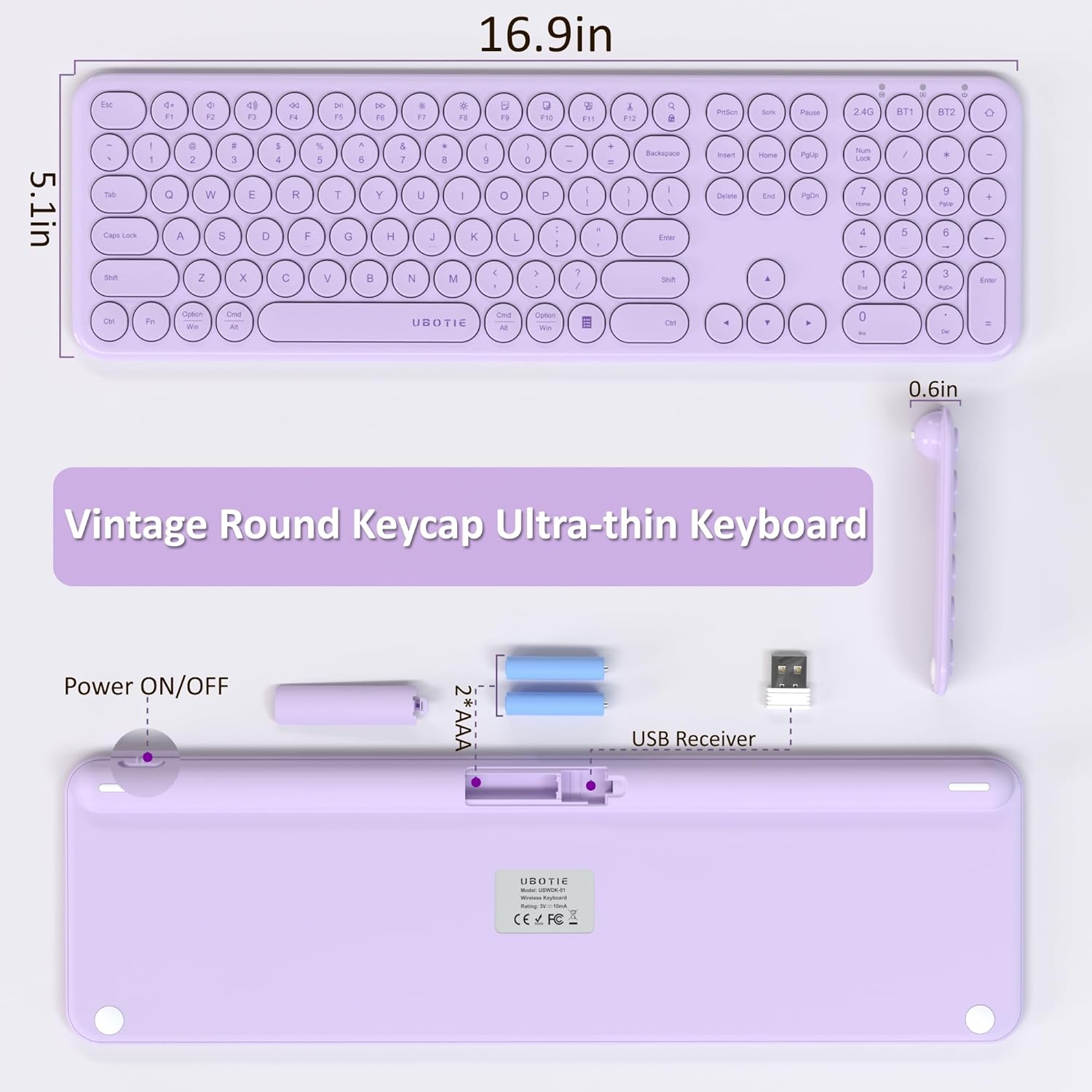 Ubotie Slim & Quiet Wireless/Bluetooth Full Size Keyboard - Purple