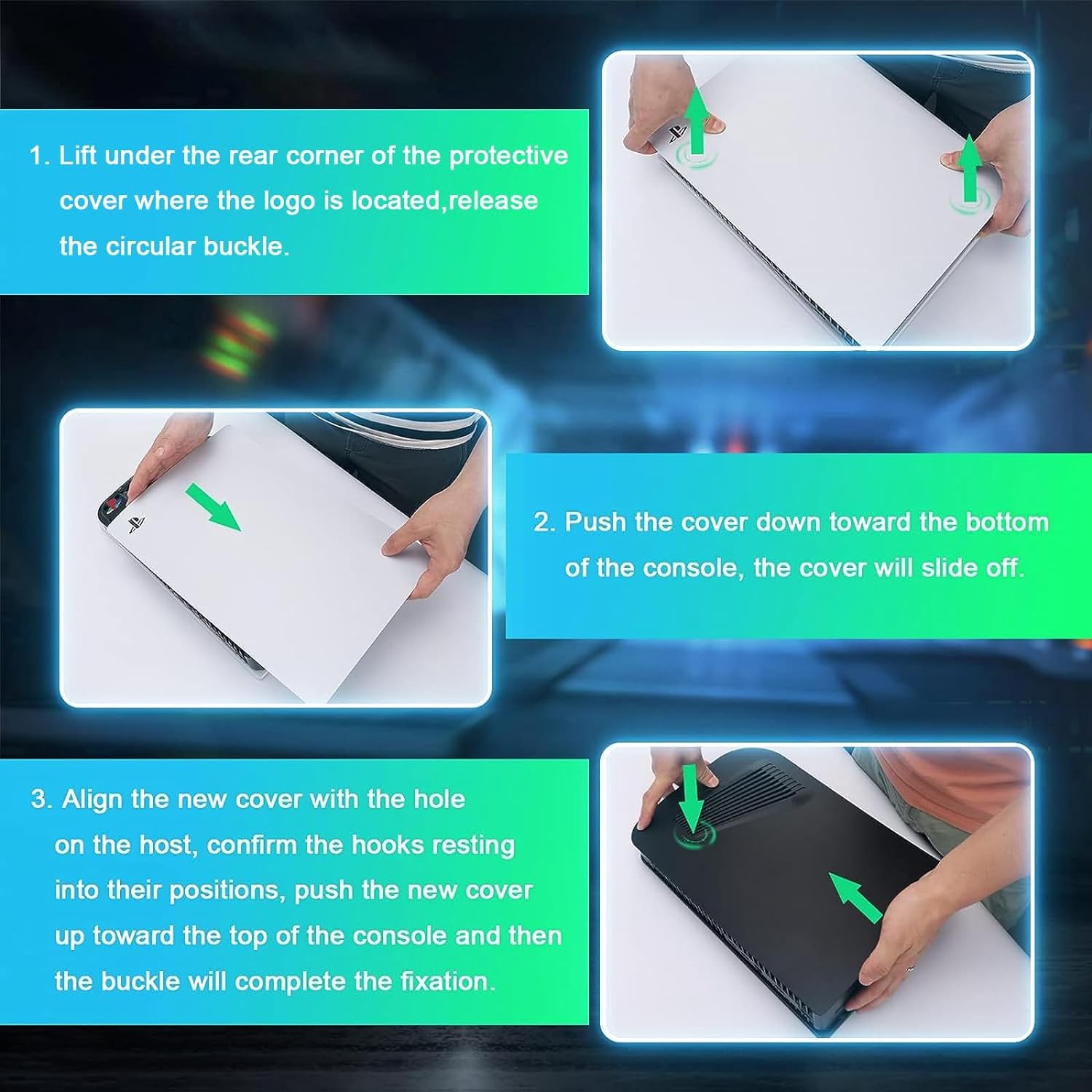 - [Easy Installation]: Everyone can replace this PS5 faceplate quickly and easily: ①Lift under the rear corner of the protective cover where the PS5 logo is located, release the circular buckle. ②Push the cover down toward the bottom of the console, the cover will slide off. ③Align the new cover with the hole on the host, confirm the hooks resting into their positions, push the new cover up toward the top of the console and then the buckle will complete the fixation.