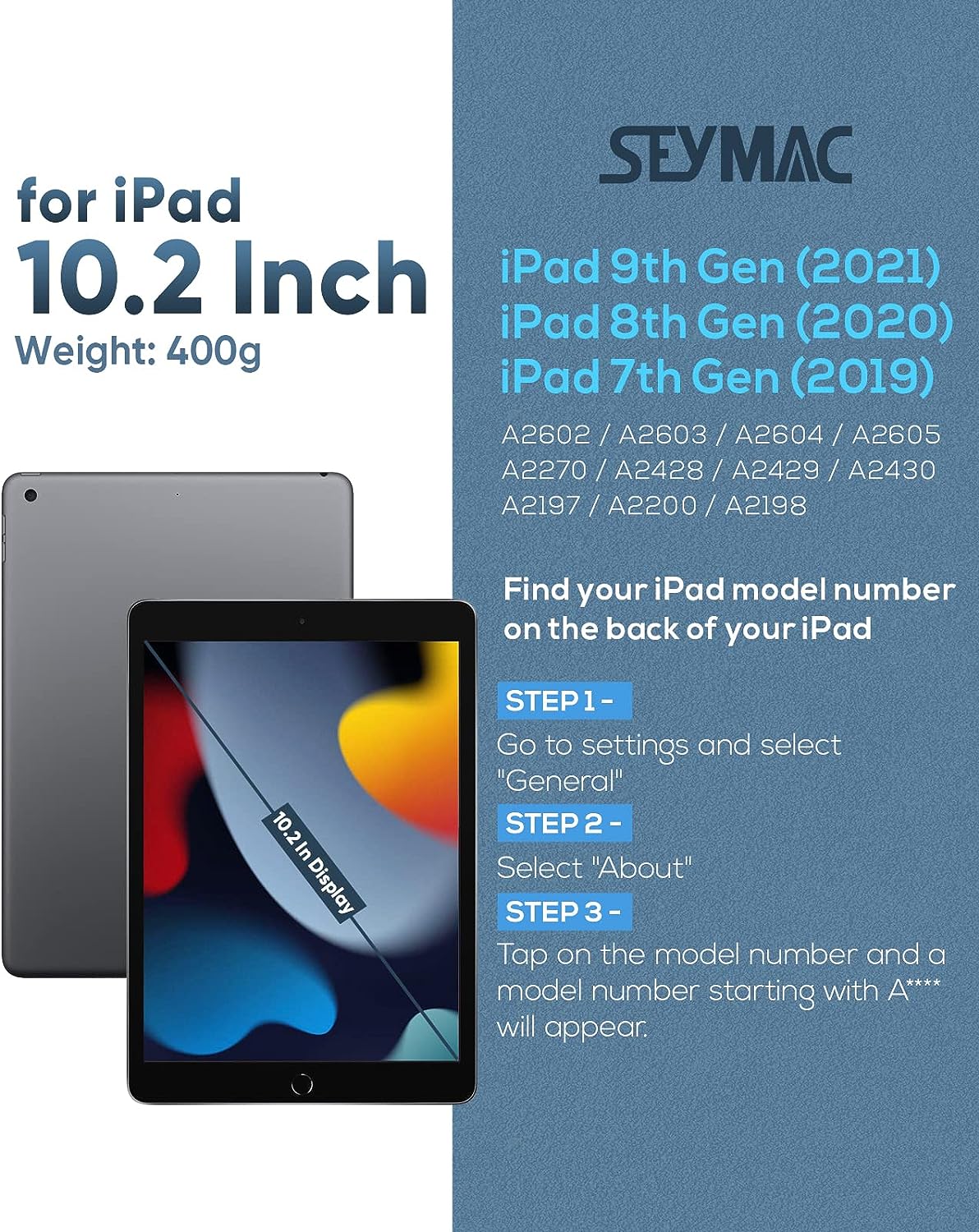 · Compatible Model - This SEYMAC iPad case is designed to fit 10.2 inch iPad 9th/ 8th/ 7th Generation 2021/ 2020/ 2019 release (Model: A2602 A2603 A2604 A2605 / A2197 A2198 A2200 / A2270 A2428 A2429 A2430).