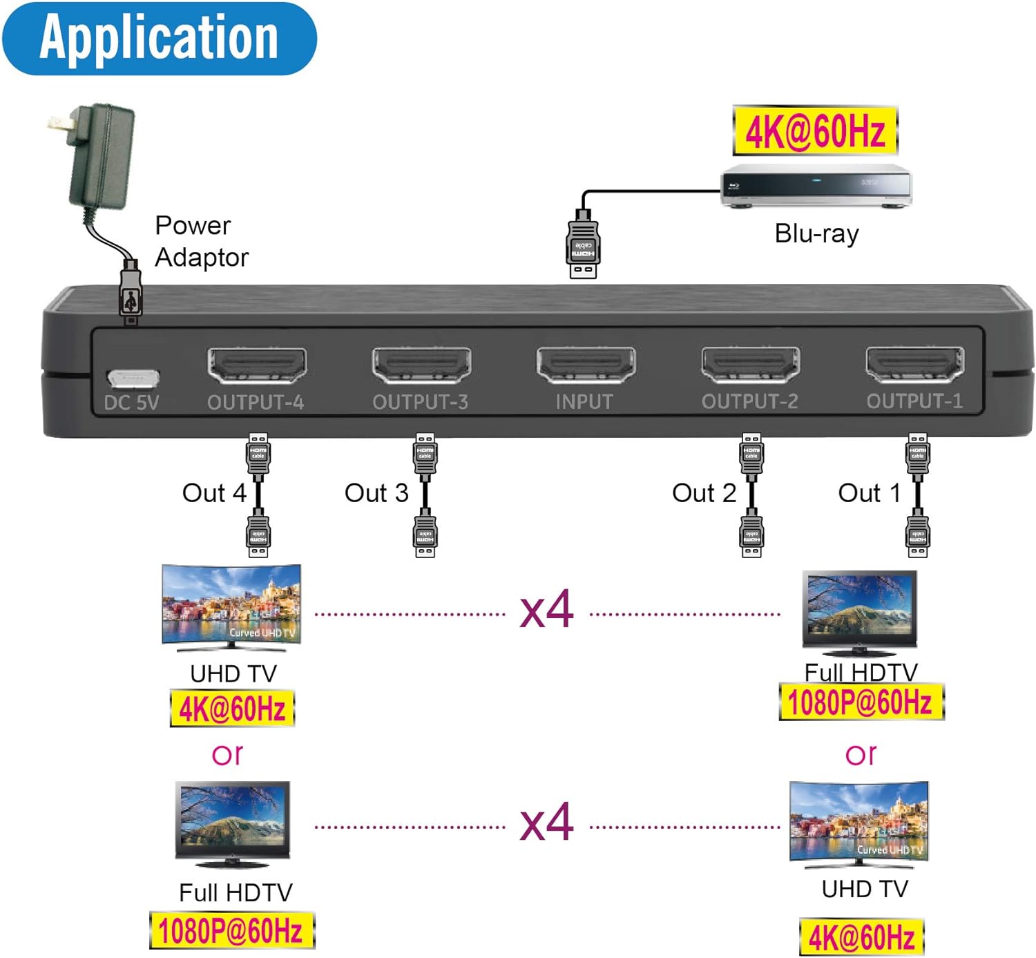 Includes: 1 x UHD-PRO104 2. 0 Splitter, 1 x DC 5V Power Adapter (100-240V, US
