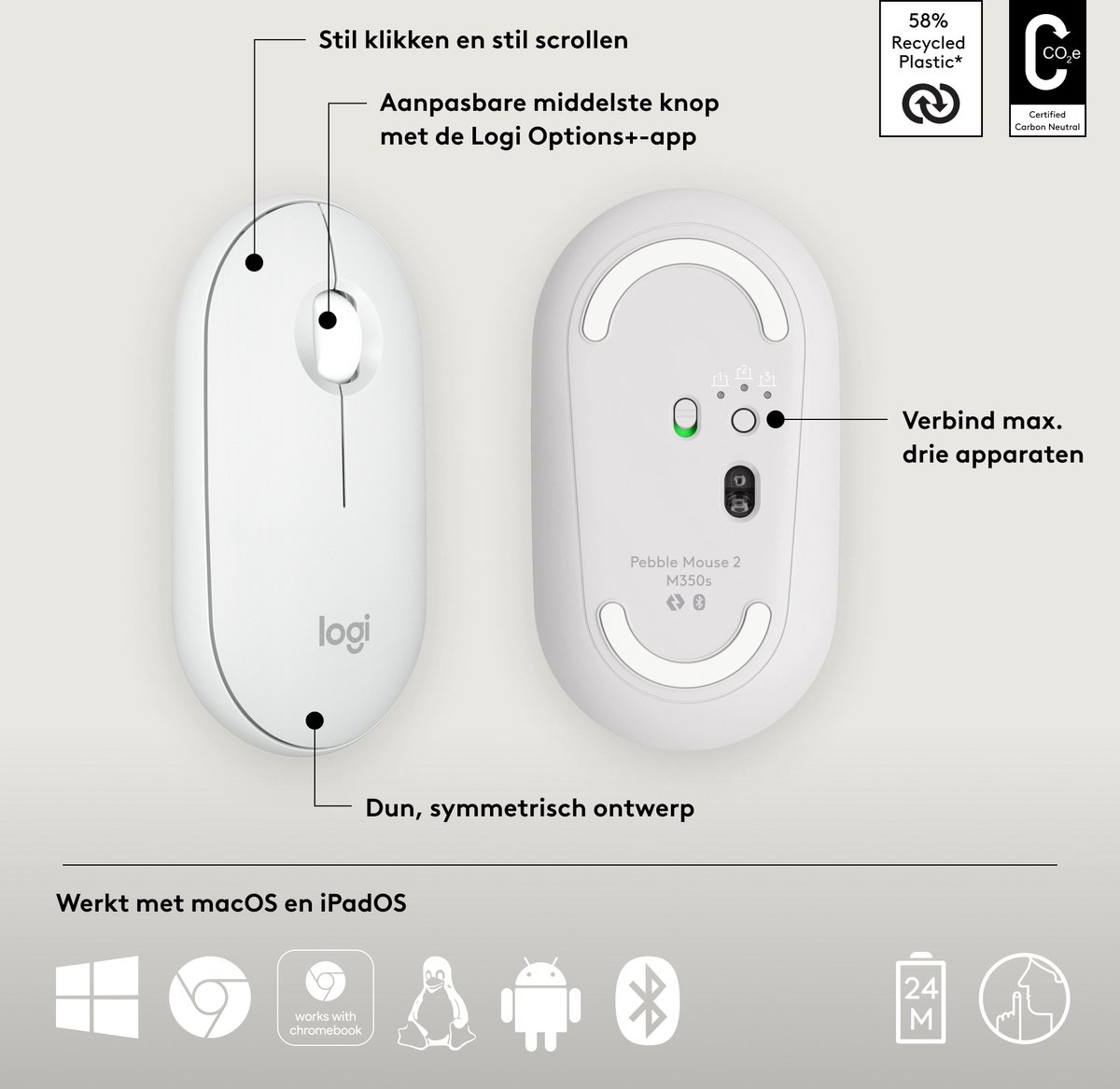 Pebble Mouse 2 M350s runs on 1 AA battery and can be connected wirelessly to