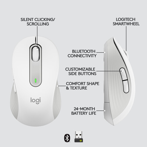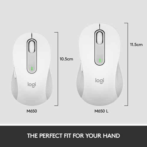 precision and comfort with the versatile off white colored Logitech Signature M650 Wireless Mouse at your side. Designed to fit comfortably into small to