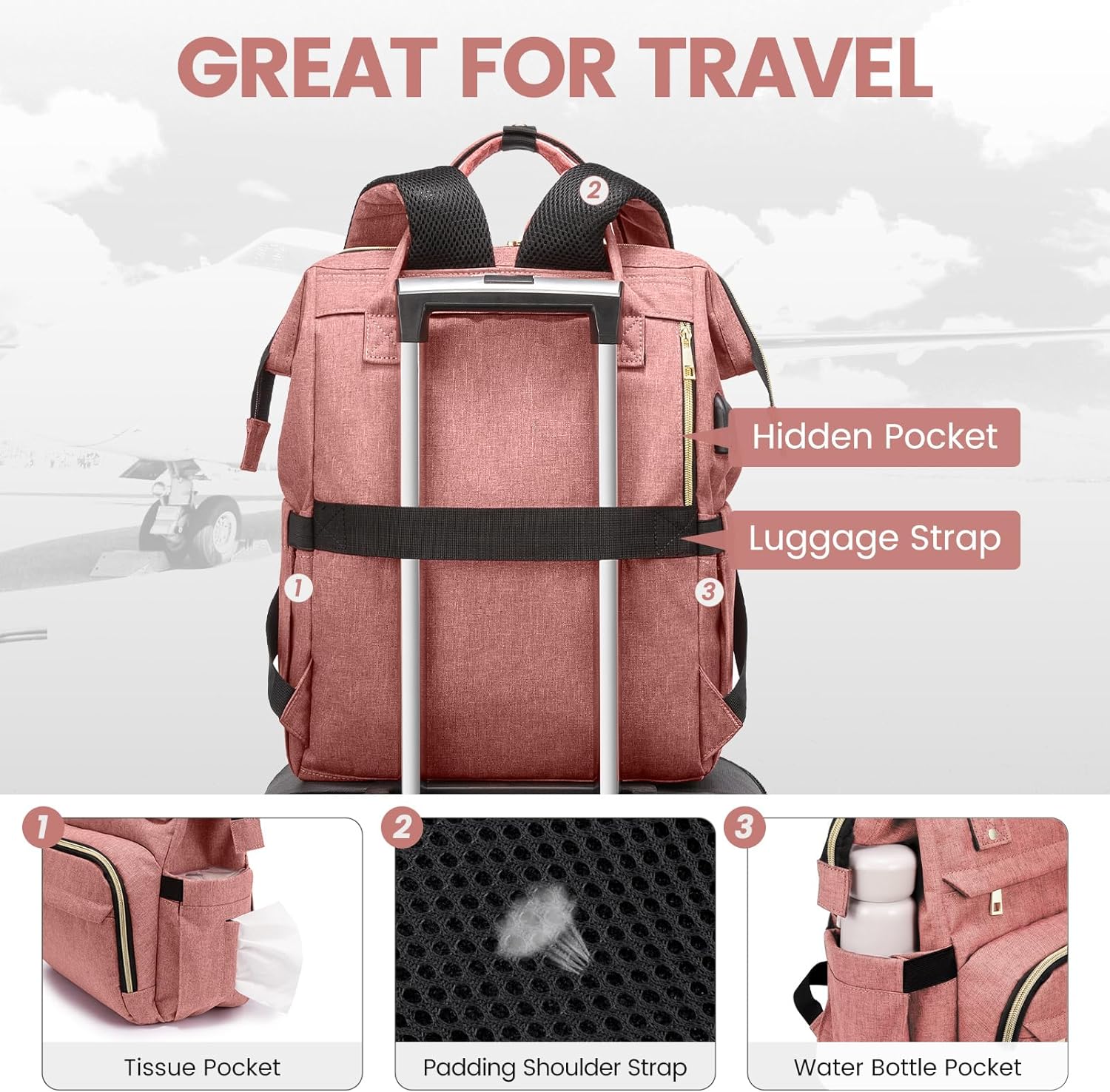 allows the back pack fit on luggage/suitcase for easier carrying. Back hidden