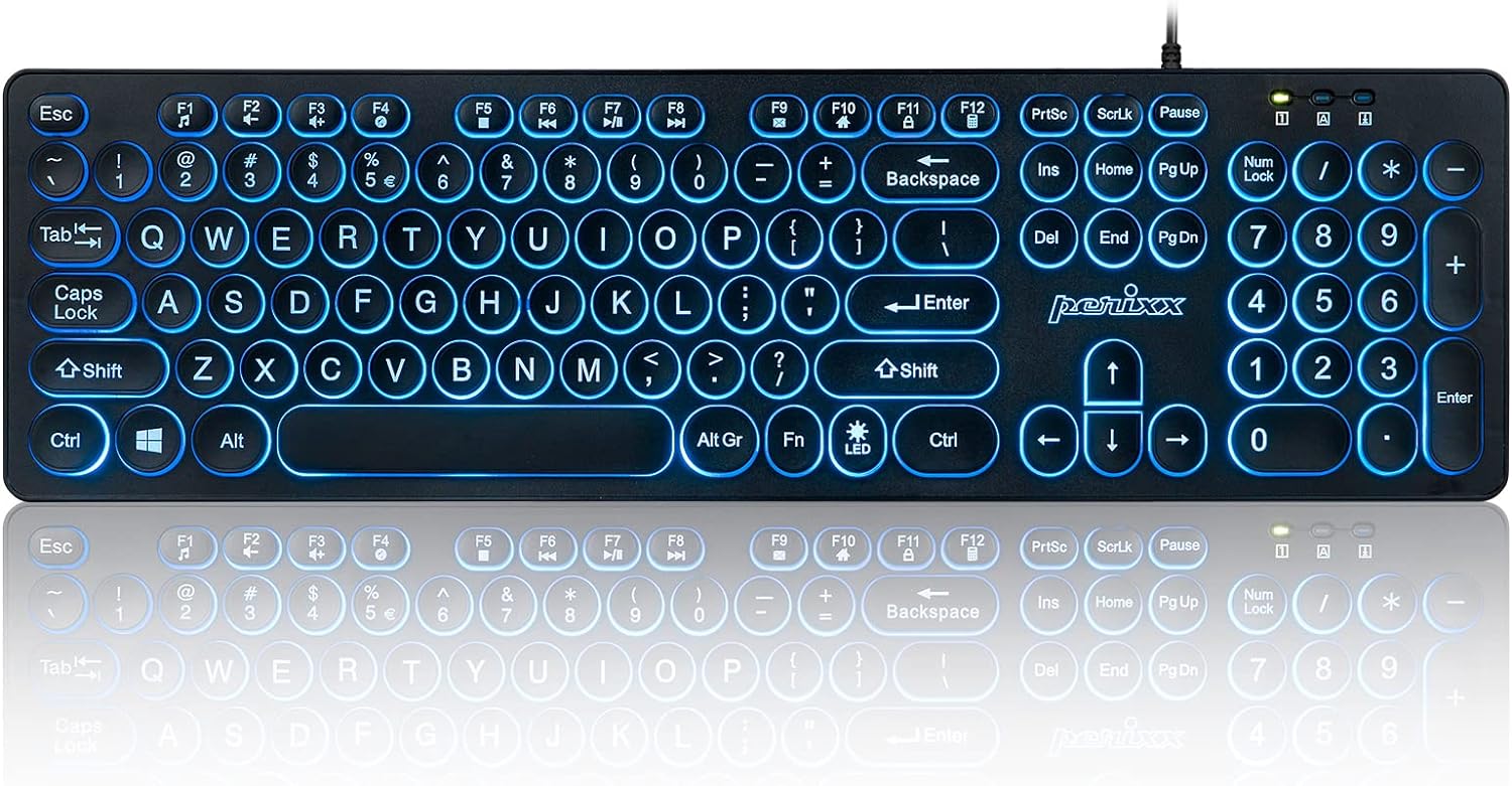 Perixx Periboard Wired Backlit USB Keyboard - Tri-Color Illuminated LED Round Keycaps