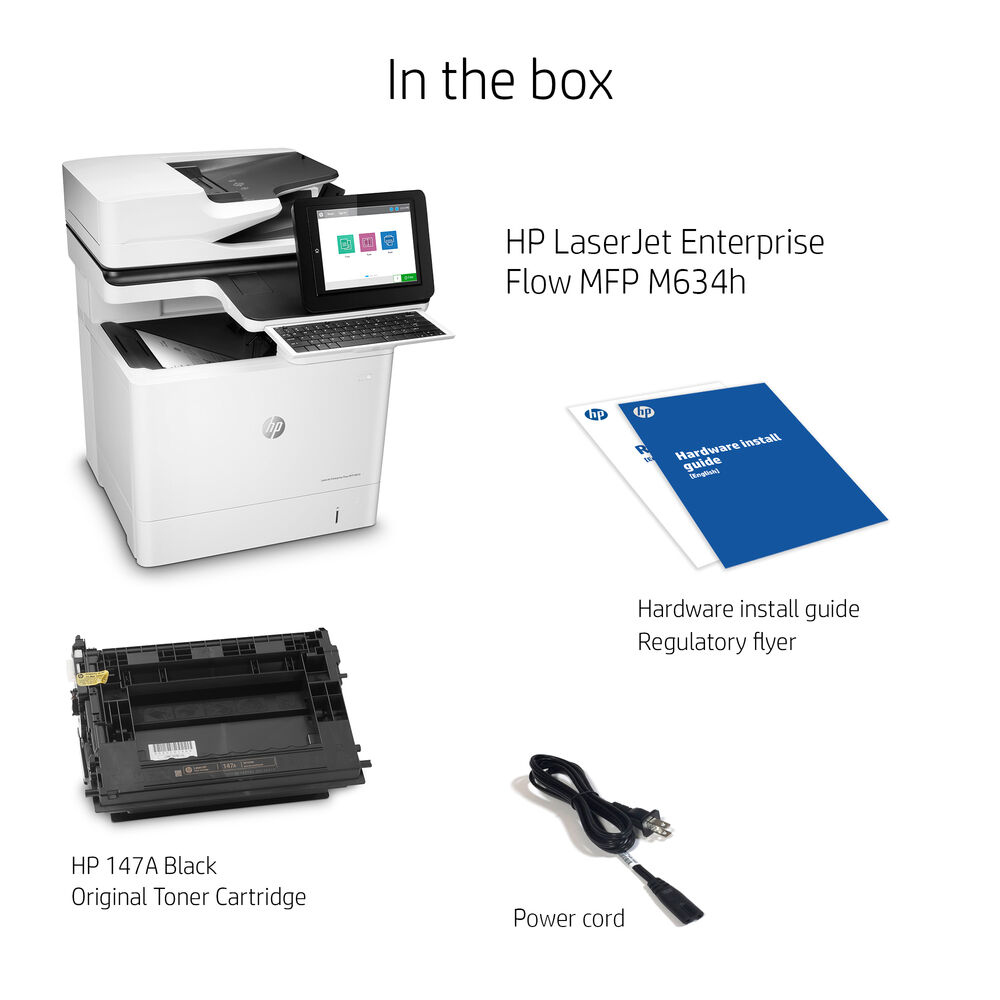 Work faster and smarter and grow your business with the LaserJet Enterprise Flow MFP M634h Printer from HP. Offering printing, scanning, and copying. This workhorse is designed to integrate neatly into home offices and small workgroups. A 150-sheet ADF, 100-sheet multipurpose tray, and 550-sheet input tray are provided for letter and legal-size paper, and a 500-sheet output bin neatly stores your printed documents. The M634h features automatic duplex printing and fast print speeds up to 50 ppm for letter-size documents, and the unit's 1200 x 1200 dpi print resolution ensures sharp text and graphics. Copy speeds are excellent as well, with a simplex copy speed of 55 cpm. Built to be durable and reliable, the M430f has a recommended monthly page volume of 5000 pages, and for energy-saving features and benefits to the planet and your budget, the printer is ENERGY STAR certified and rated EPEAT Silver.