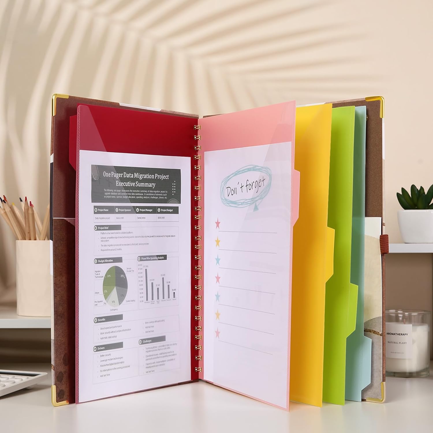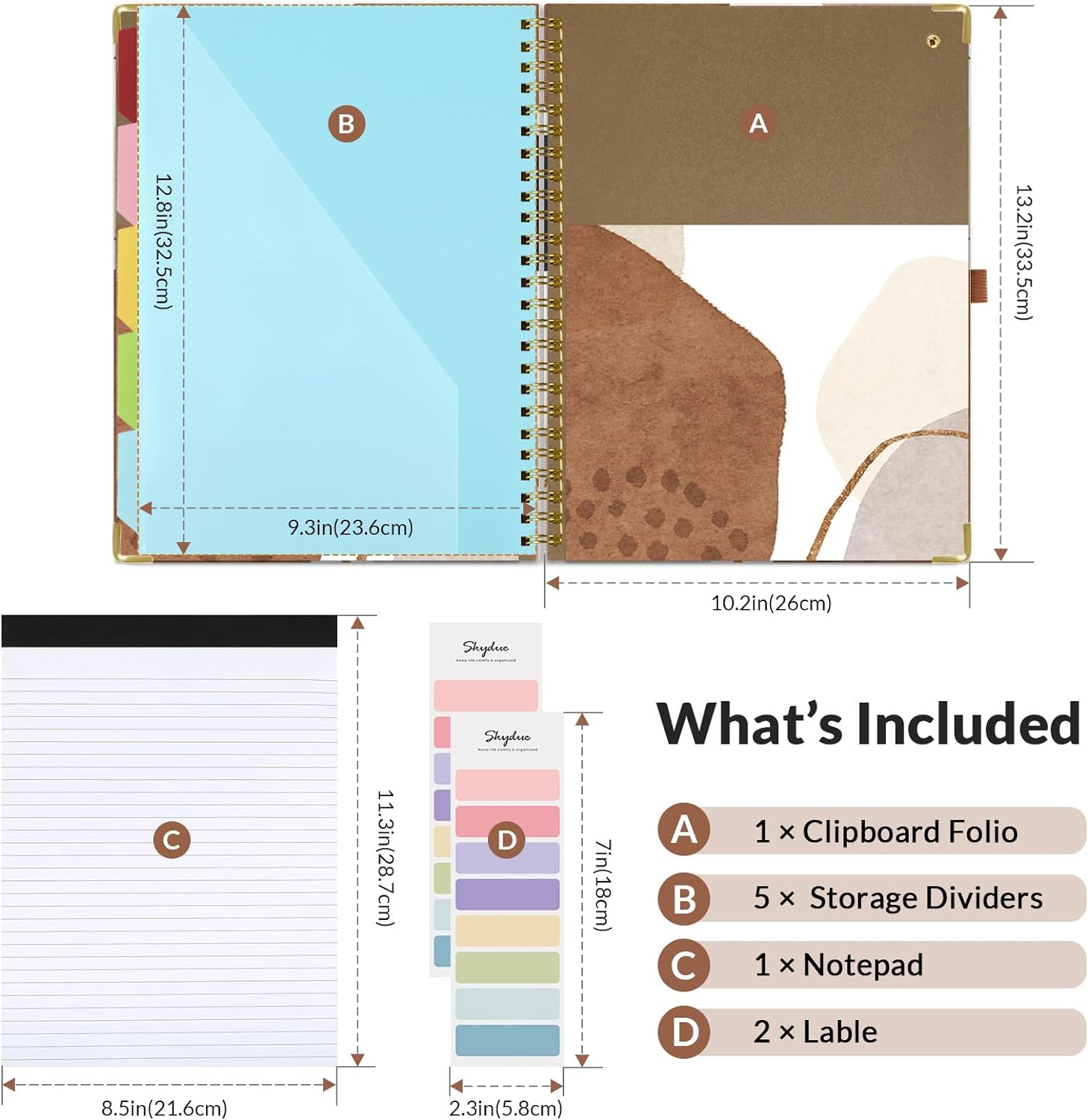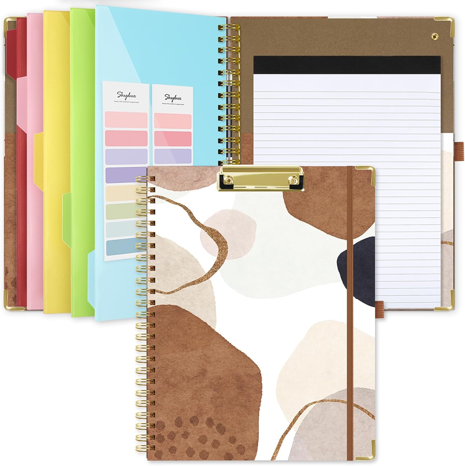 SKYDUE Spiral Clipboard Folio with Notepad and Pocket (includes 5 Dividers with 10 Pockets) - Brown