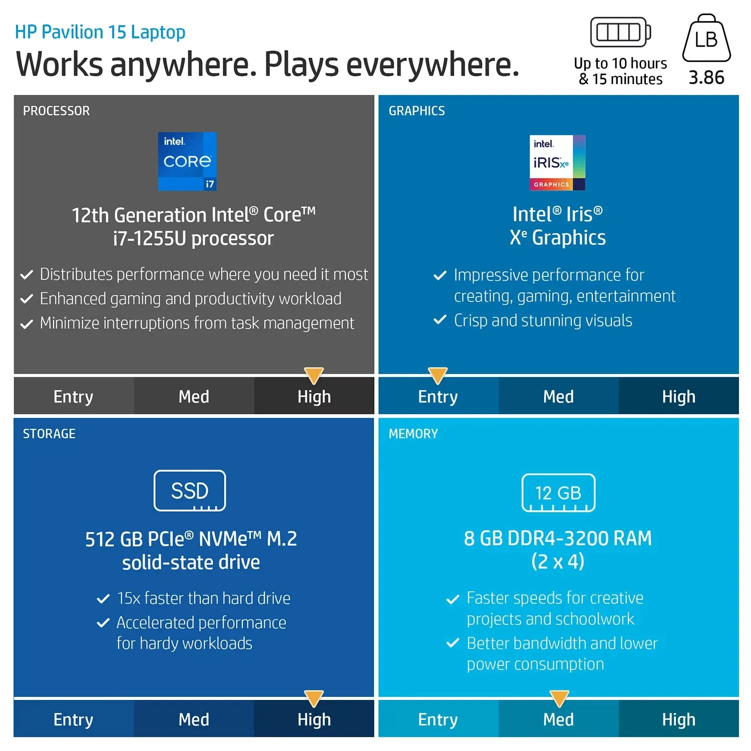 HP 15.6" Pavilion FHD Laptop - 12th Gen i7-1255U - 8GB RAM - 512GB SSD, W11H