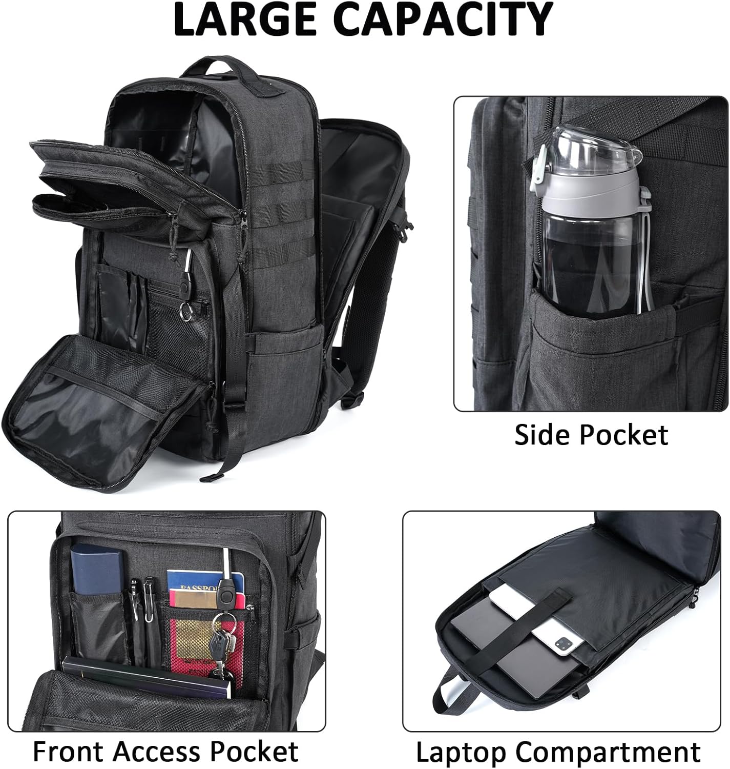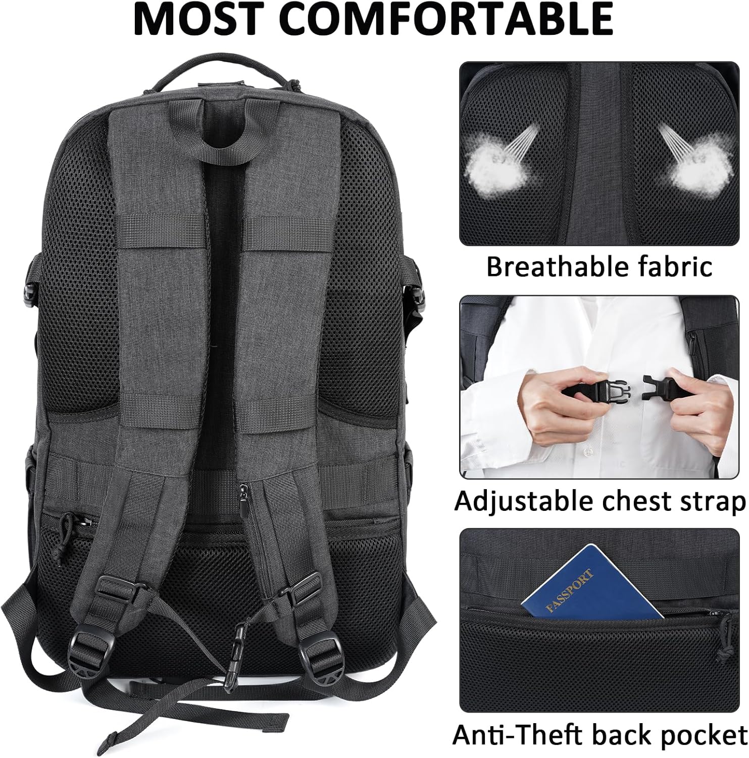 - Comfortable: Large travel backpack for men equipped with an adjustable chest strap, air mesh breathable back panel and thickened shoulder straps. It can effectively relieve the pressure on the shoulder and neck, ensure optimum comfort for hours of carrying. An anti theft back pocket is suitable for valuables. Side compression straps help to tamp down a half full bag to eliminate excess space. Compressing a pack closer to your body, and a more comfortable overall carrying experience