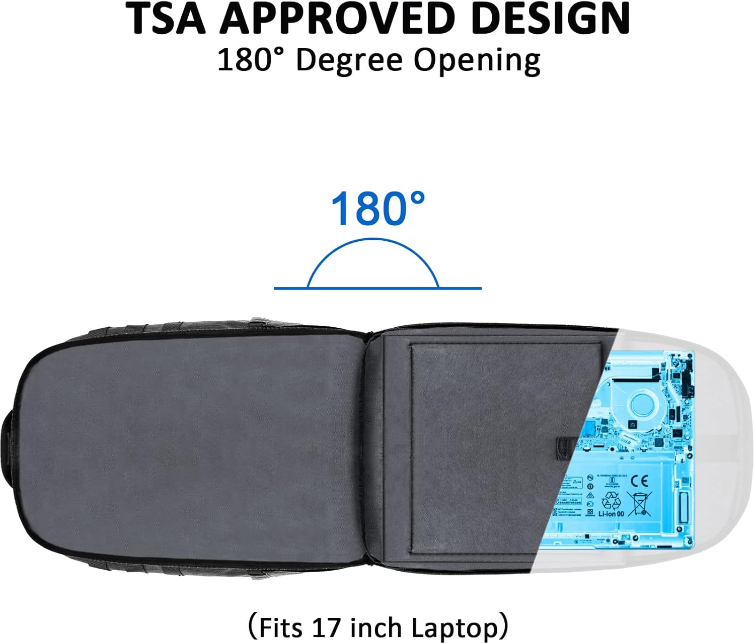 - Large and Multiple Compartments: This laptop backpack for men featuring TSA laptop compartment fits under 17 inch laptop, and it can be laid flat at 180 degrees that get through security quickly. With a roomy main storage area, sunglasses compartment, side bottle pocket, front organizer pocket and a quick access compartment. 32 L large capacity, organized and airline approved size (19.5" x 12.5" x 8") make it useful as a travel backpack