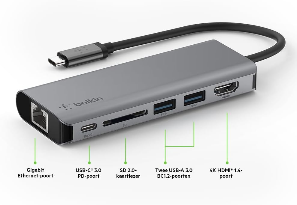 - Turns your USB-C port into an HDMI port, two USB-A 3.0 BC1.2 ports, an Ethernet port, an SD card reader and a USB-C PD port
