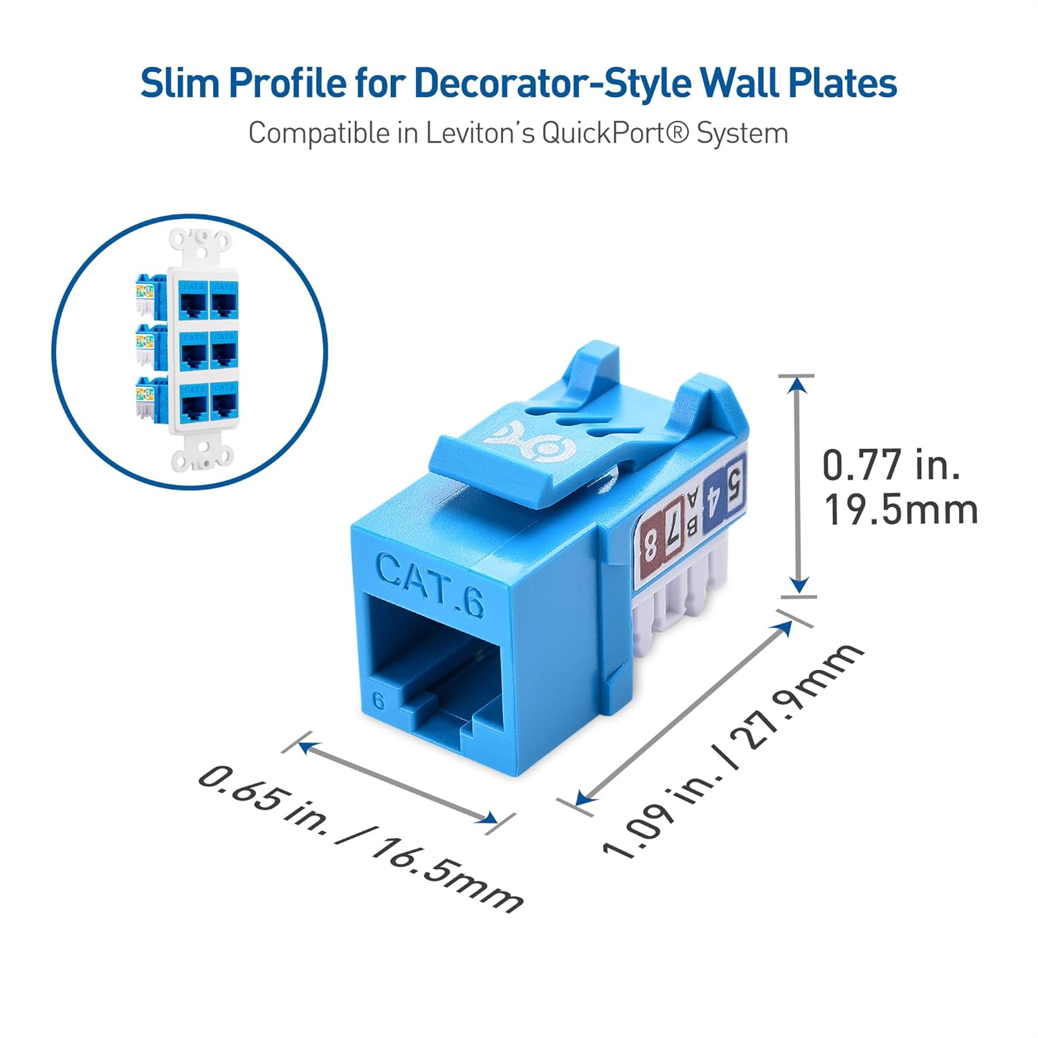 - Slim profile Cat6 RJ45 keystone jacks fit a patch panel, wall plate, or surface mount box with standard or slim keystone blank openings; Slim profile Cat 6 keystone jack accepts 23 and 24 AWG unShielded twisted pair (UTP) cable: compatible with Leviton QuickPort System and slim Cat6 Decora style wall plates.