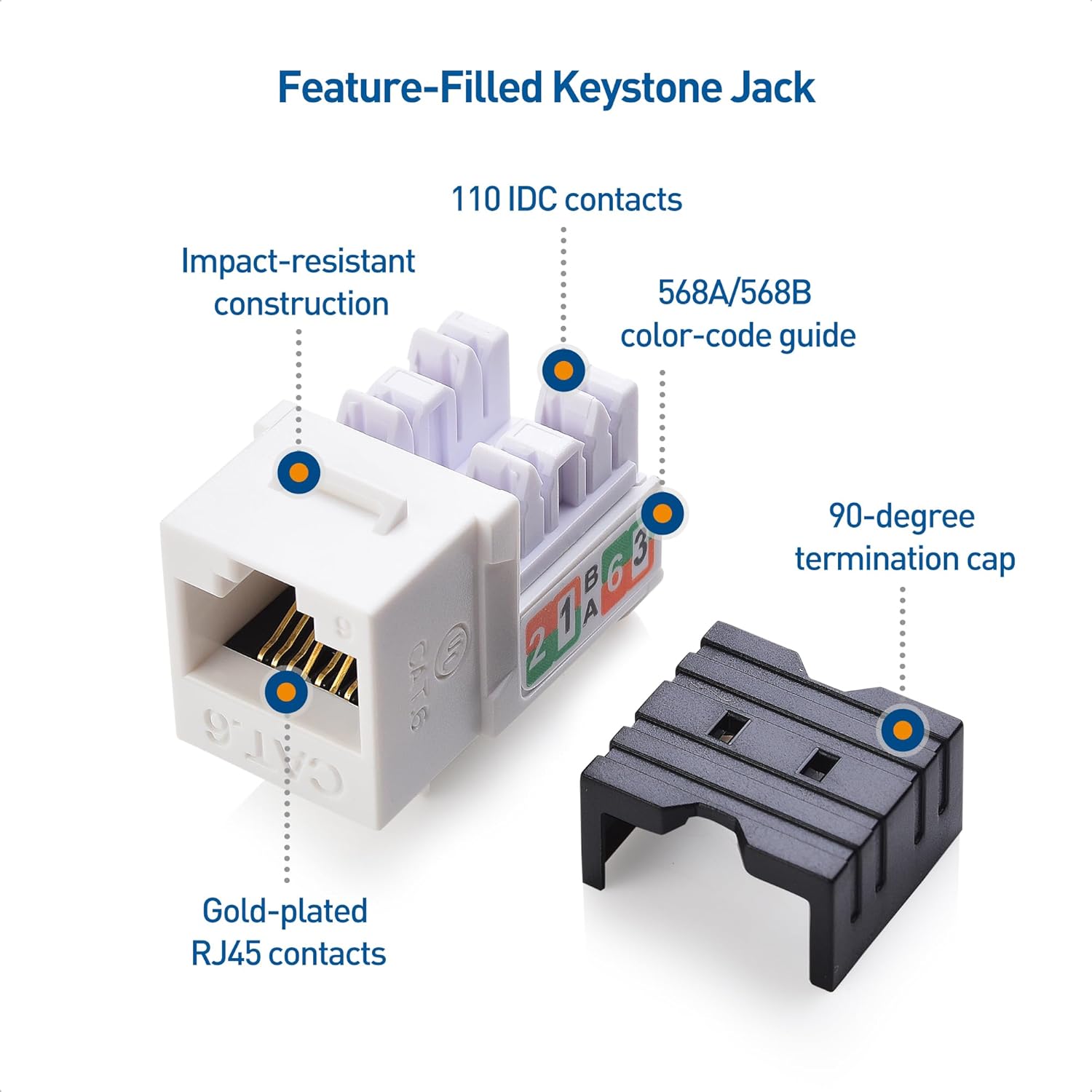 - 10 Gigabit Ethernet with Cat 6 Ethernet cables terminated into this Cat6 keystone jack; Ethernet keystone jack is backwards compatible with a 10/100 Ethernet network and Cat5e cable; Meets or exceeds Category 6 performance in compliance with the ANSI/TIA/EIA 568-C.2 standard.