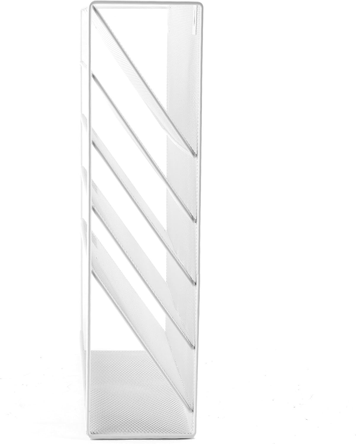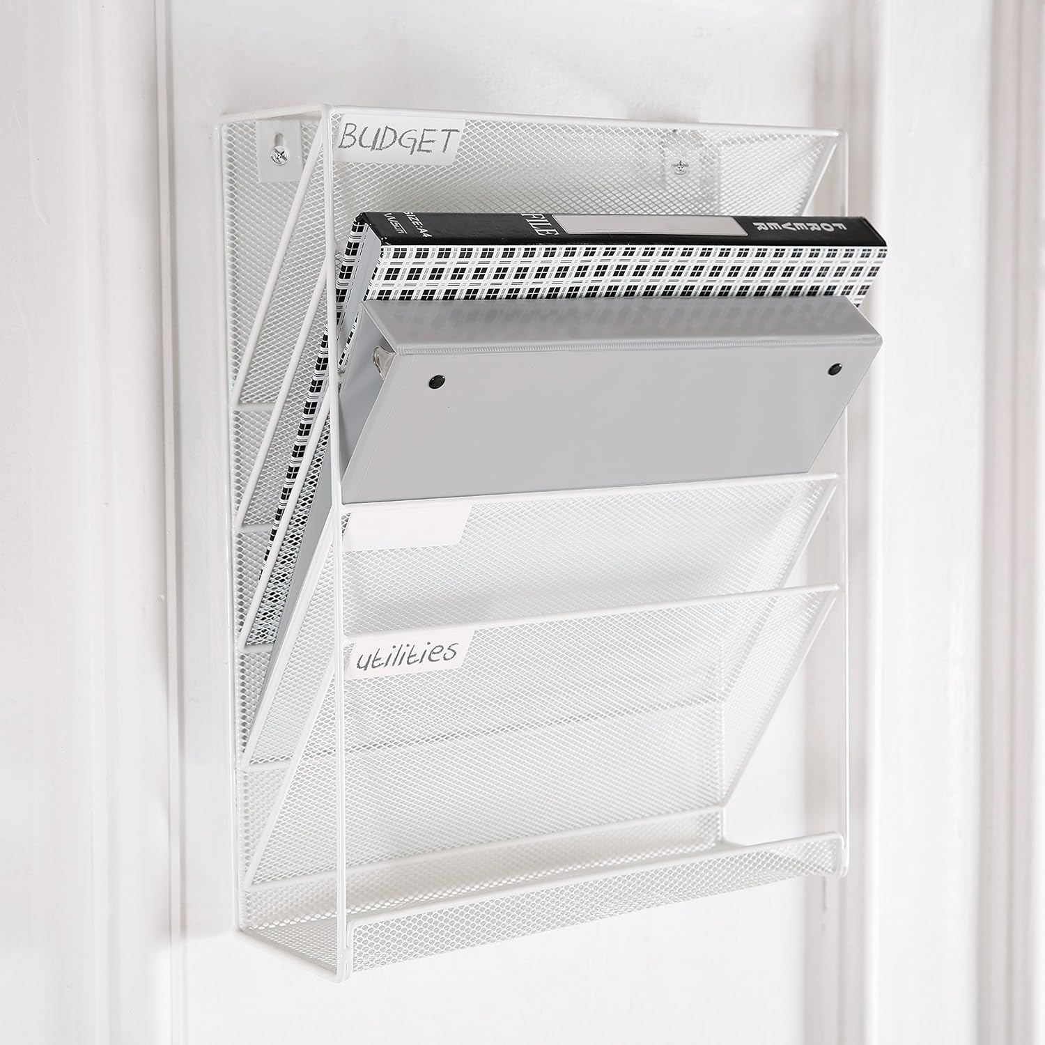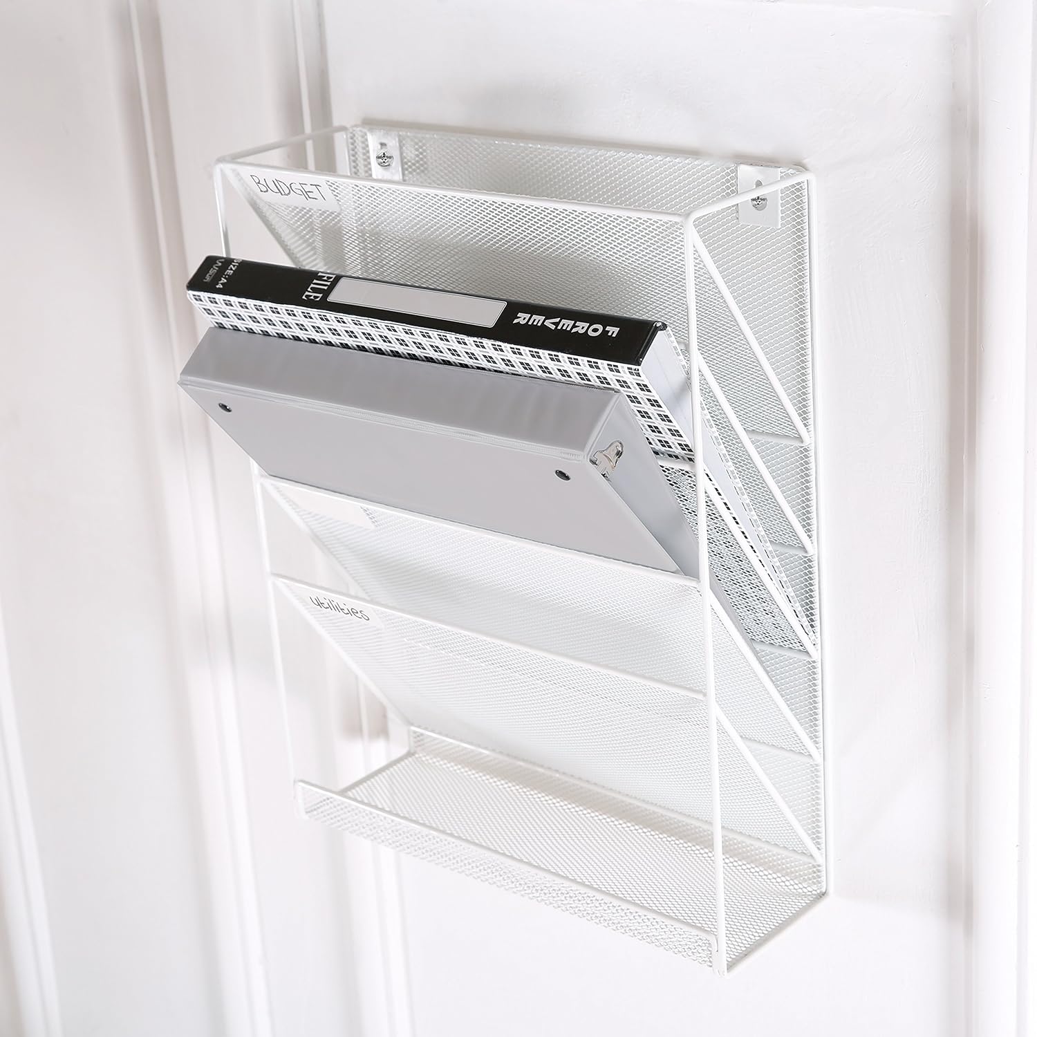 Wall Mounted Mesh Metal Office Document File Folder Magazine Holder Rack Hanging Filing System with Bottom Storage Shelf with 5 Slanted Slots - White