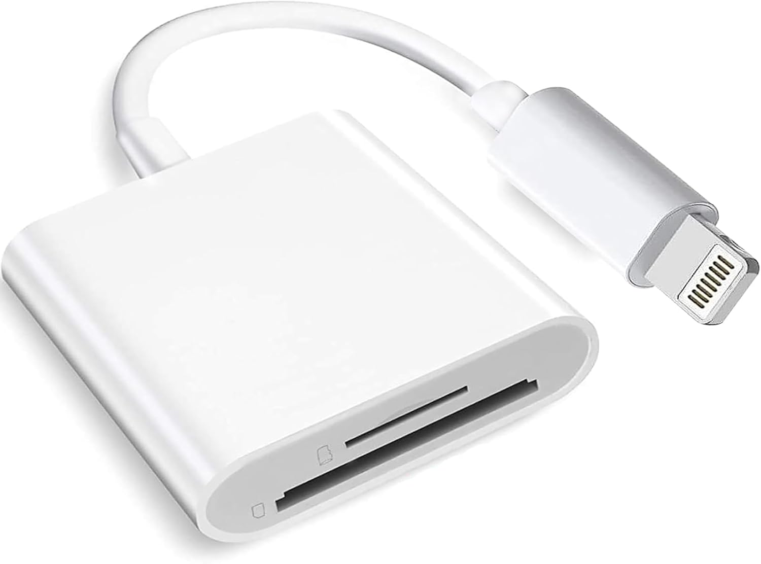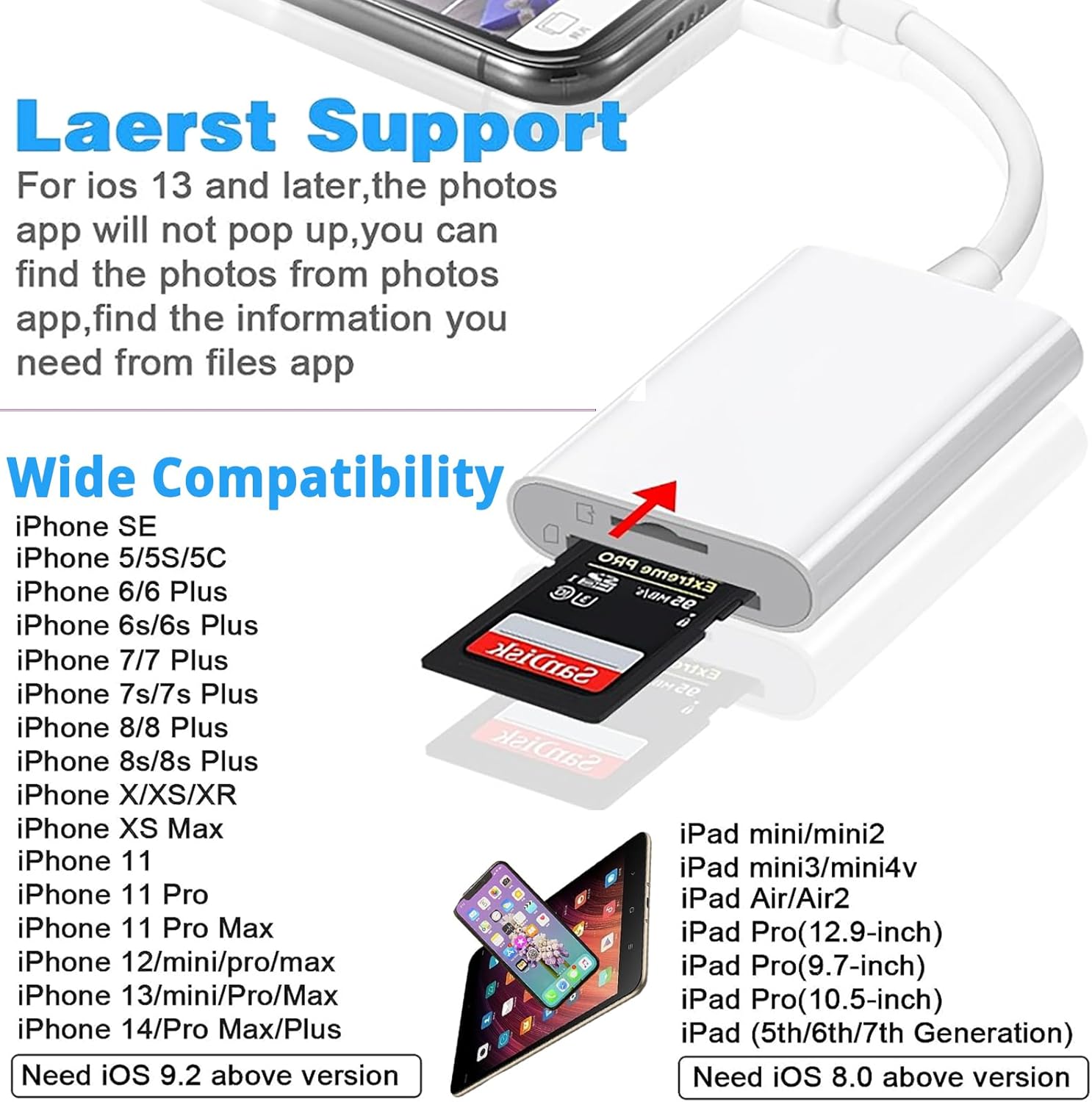 • Wide Compatibility: The iPhone SD card reader Compatible with iPhone 14 / 13 / 13 mini / 13 Pro / 13 Pro Max / 12 / 12 mini / 12 Pro / 12 Pro Max /11 / 11 Pro / X / XS / XS Max / XR / 8/8 Plus / 7/7 Plus / 6s / 6s Plus / 6/6 Plus / SE and iPad Air / Mini / Pro, etc