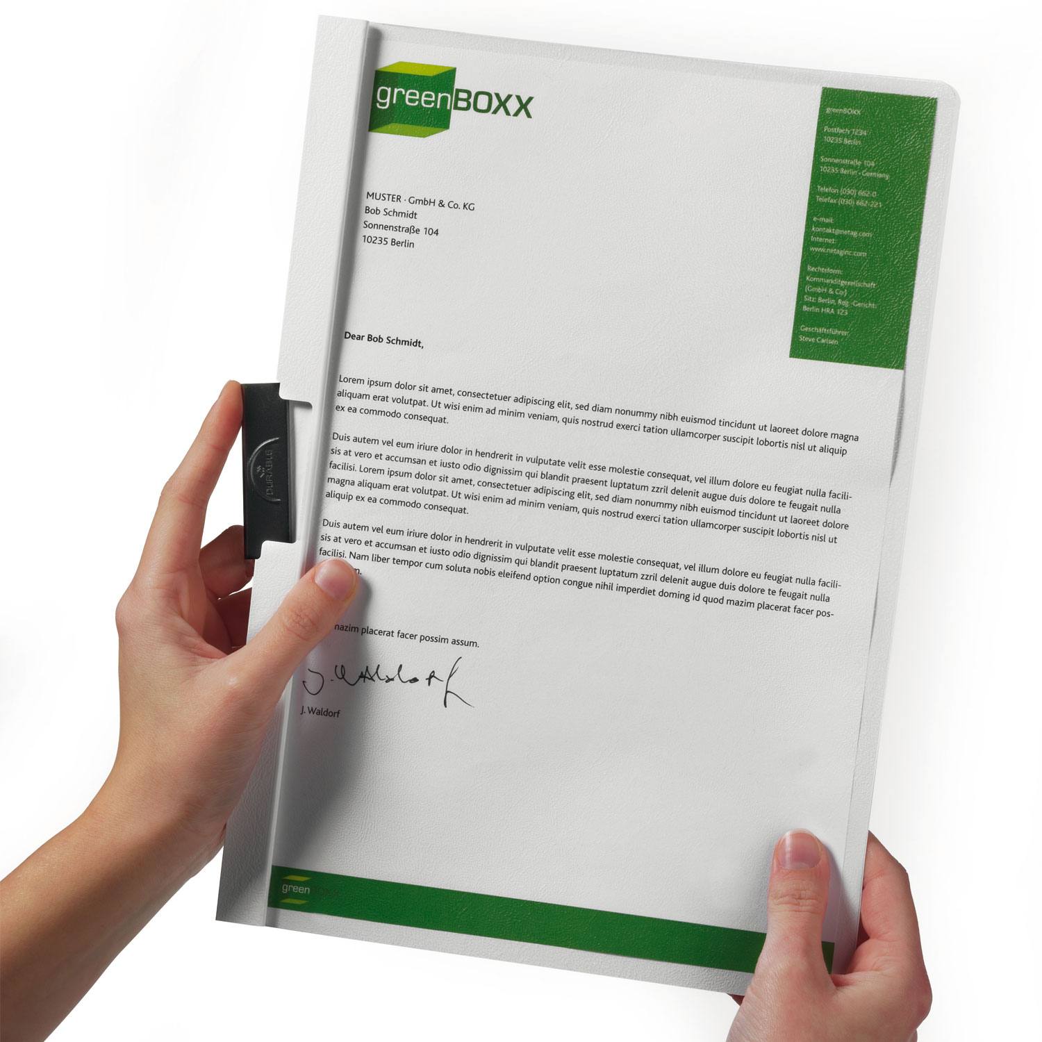DURABLE DURACLIP A4 FOLDER DARK GREEN - 30 SHEETS. The original DURACLIP file made of PVC plastic with a special sprung steel clip. Ideal for presentations, filing, quotations, conference / seminar notes and reports. The DURACLIP 30 folder has a capacity of 30 A4 sheets, a transparent front coverr and coloured back and spine. A full range of additional accessorie are available. Cover imprints, such as company logos, transform DURACLIP into a unique advertising facility. DURACLIP can also be supplied in special colours. The DURACLIP® system: Pull out the clip, insert the documents and push back the clip - simple! The unique sprung steel clip adjusts itself to the number of sheets - time after time.