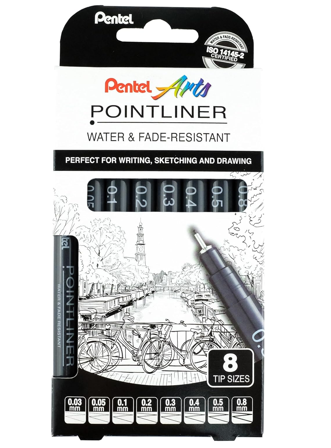 - A pack of eight fineliner pensl, all with black ink. One of each of the following nib sizes from ultra fine to bold point : 0.03mm, 0.05mm, 0.1mm, 0.2mm, 0.3mm, 0.4mm, 0.5mm, & 0.8mm.