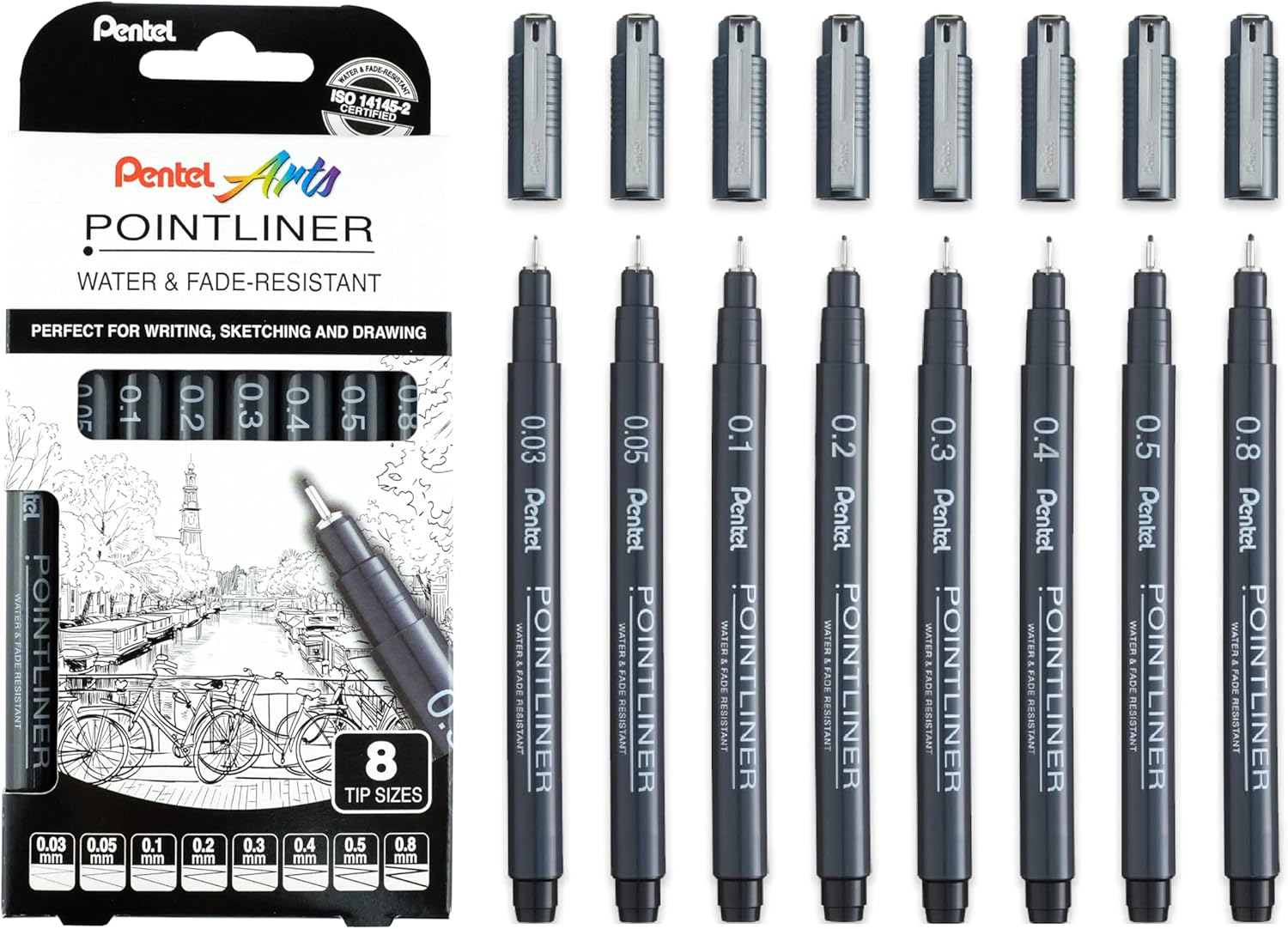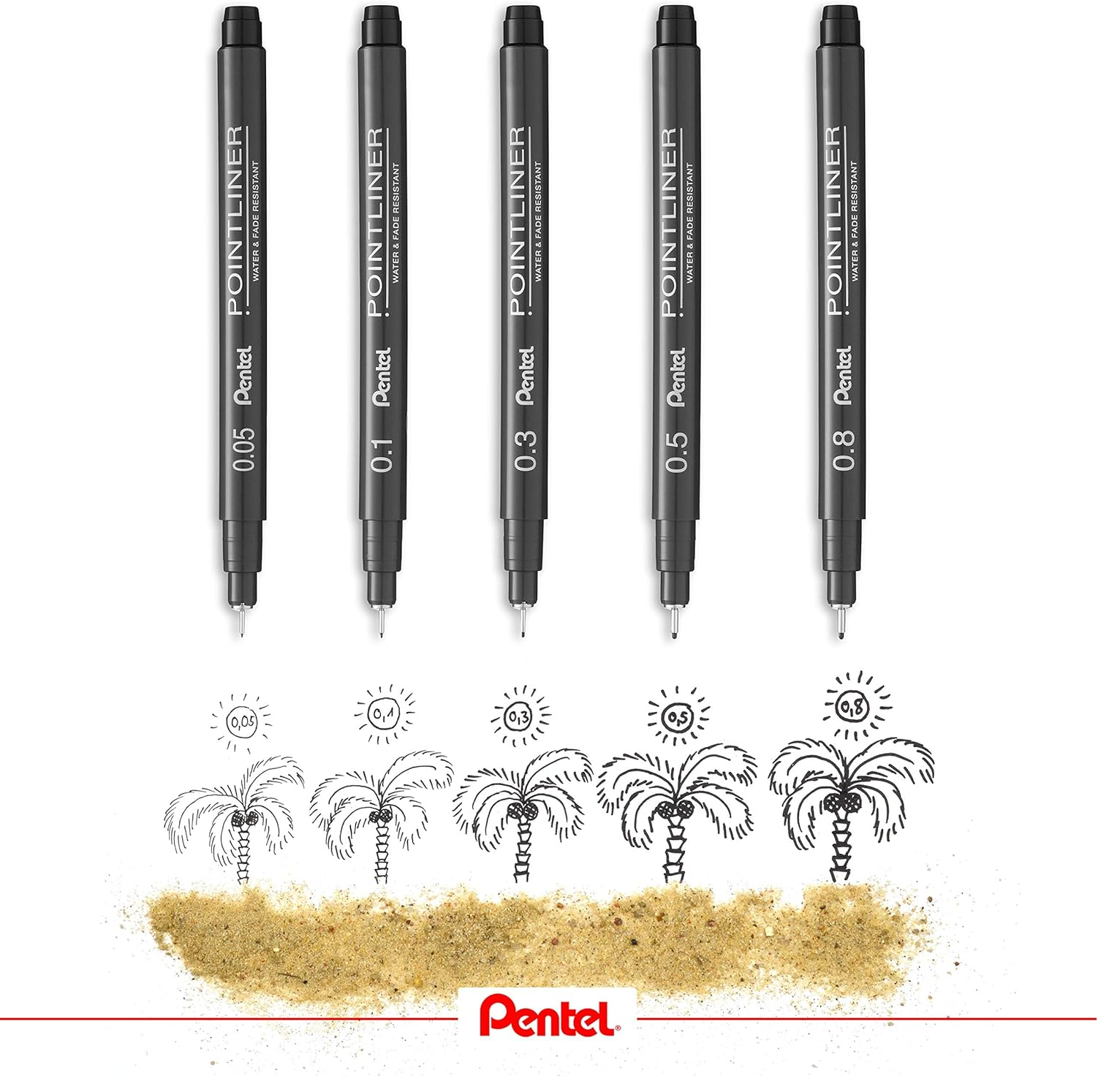 Pentel Pointliner Pigment Liner Technical Drawing Fineliner Pen S20P - 0.03mm, 0.05mm, 0.1mm, 0.2mm, 0.3mm, 0.4mm, 0.5mm, 0.8mm - Black Ink - Pack of 8