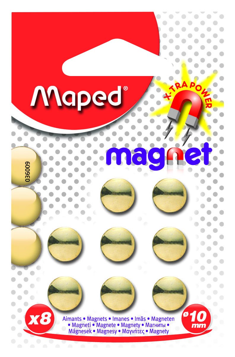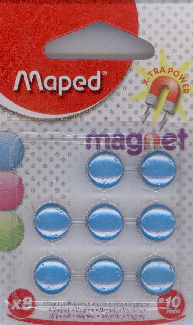 Maped magnets in blister on blister. diameter 10 mm, 8 pieces, one color per blister (green, blue or fuchsia)