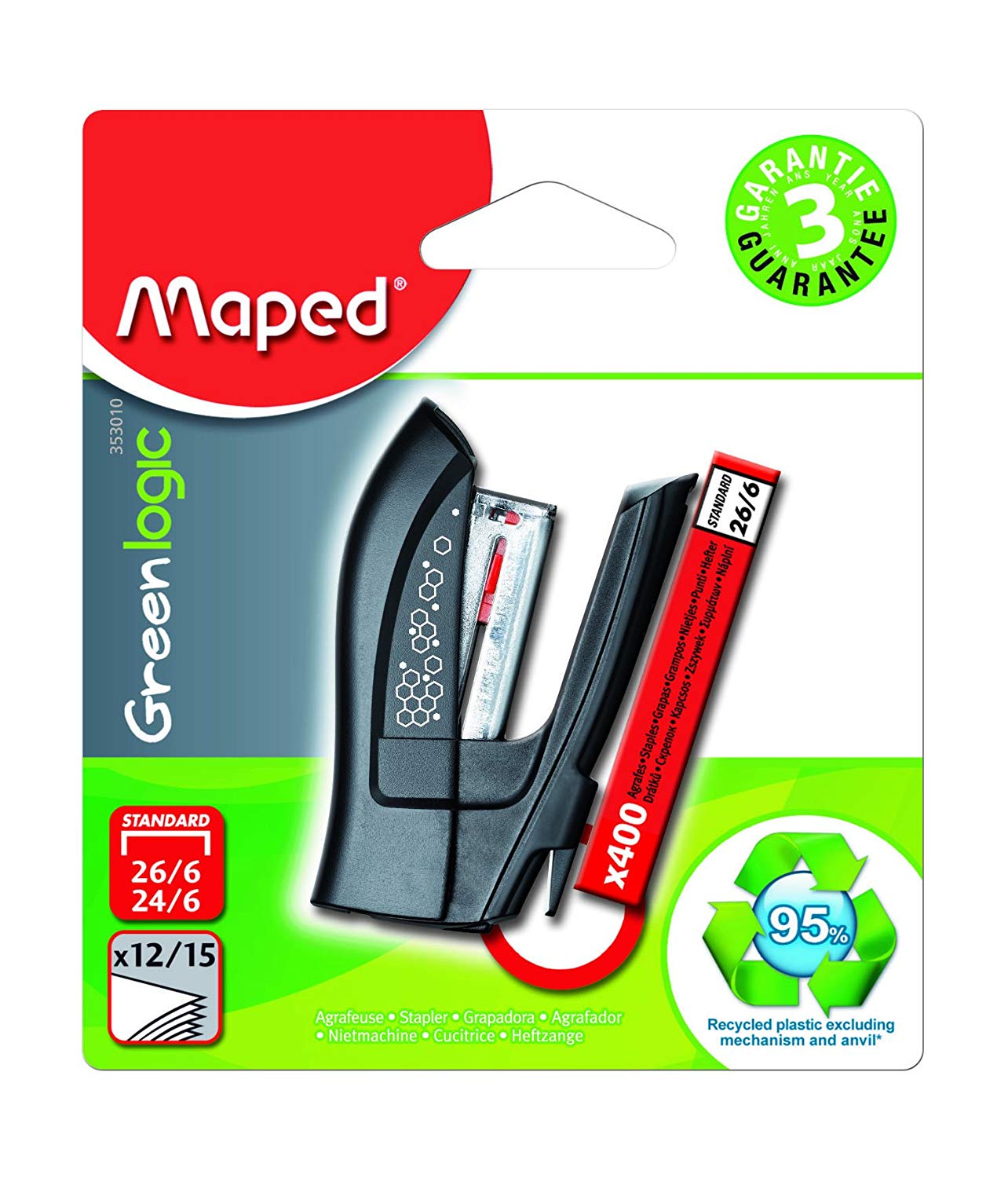 Maped Stapler Mini Standard Green Logic, black stapling capacity: 20-25 sheets, insertion depth. 28 mm, for staples No. 24/6 or 26/6, from 95 recycled plastic, integrated staple remover, level indicator of the staple cartridge can be positioned vertically and horizontally, in carton